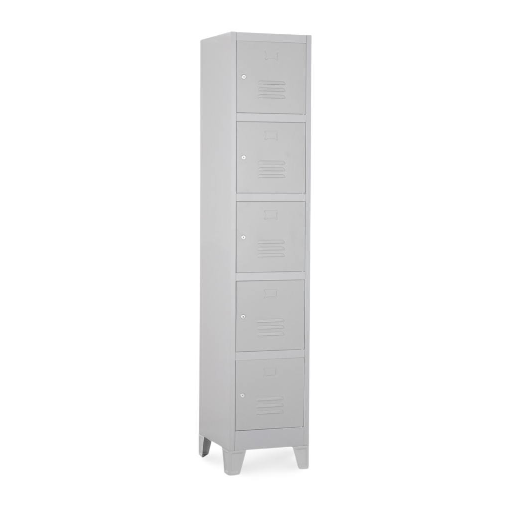 Kovová šatní skříňka disponuje 5 samostatnými boxy umístěnými na sobě. Každý z nich nabízí dostatek úložného prostoru pro osobní věci i oděvy.