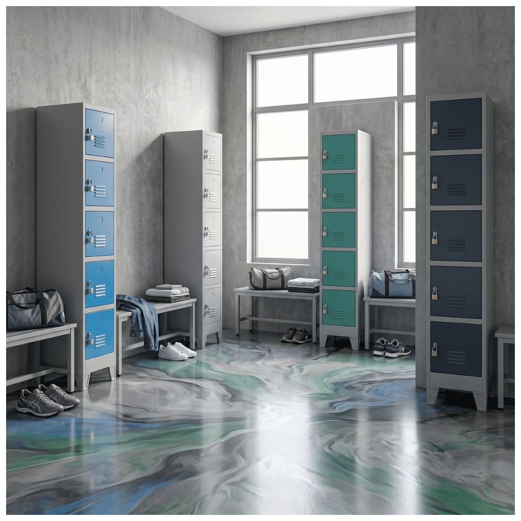 Kovová šatní skříňka disponuje 5 samostatnými boxy umístěnými na sobě. Každý z nich nabízí dostatek úložného prostoru pro osobní věci i oděvy.