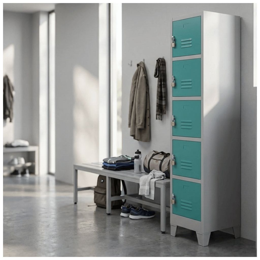 Kovová šatní skříňka disponuje 5 samostatnými boxy umístěnými na sobě. Každý z nich nabízí dostatek úložného prostoru pro osobní věci i oděvy.