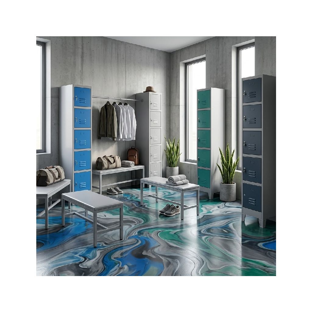 Kovová šatní skříňka disponuje 5 samostatnými boxy umístěnými na sobě. Každý z nich nabízí dostatek úložného prostoru pro osobní věci i oděvy.