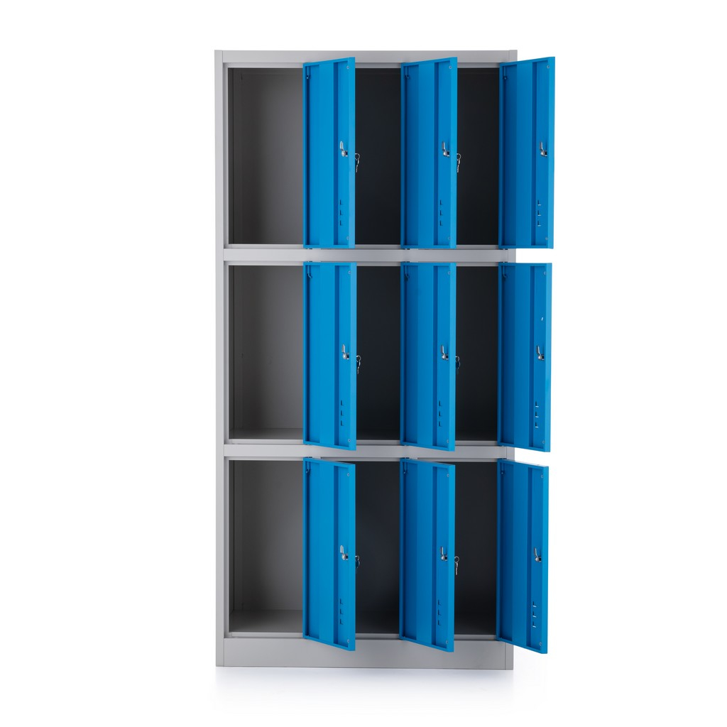 Kovová šatní skříňka disponuje 9 samostatnými boxy v rozložení 3 × 3. Každý z nich nabízí dostatek úložného prostoru pro osobní věci i oděvy – 29 × 58 × 42 cm (šířka × výška × hloubka).