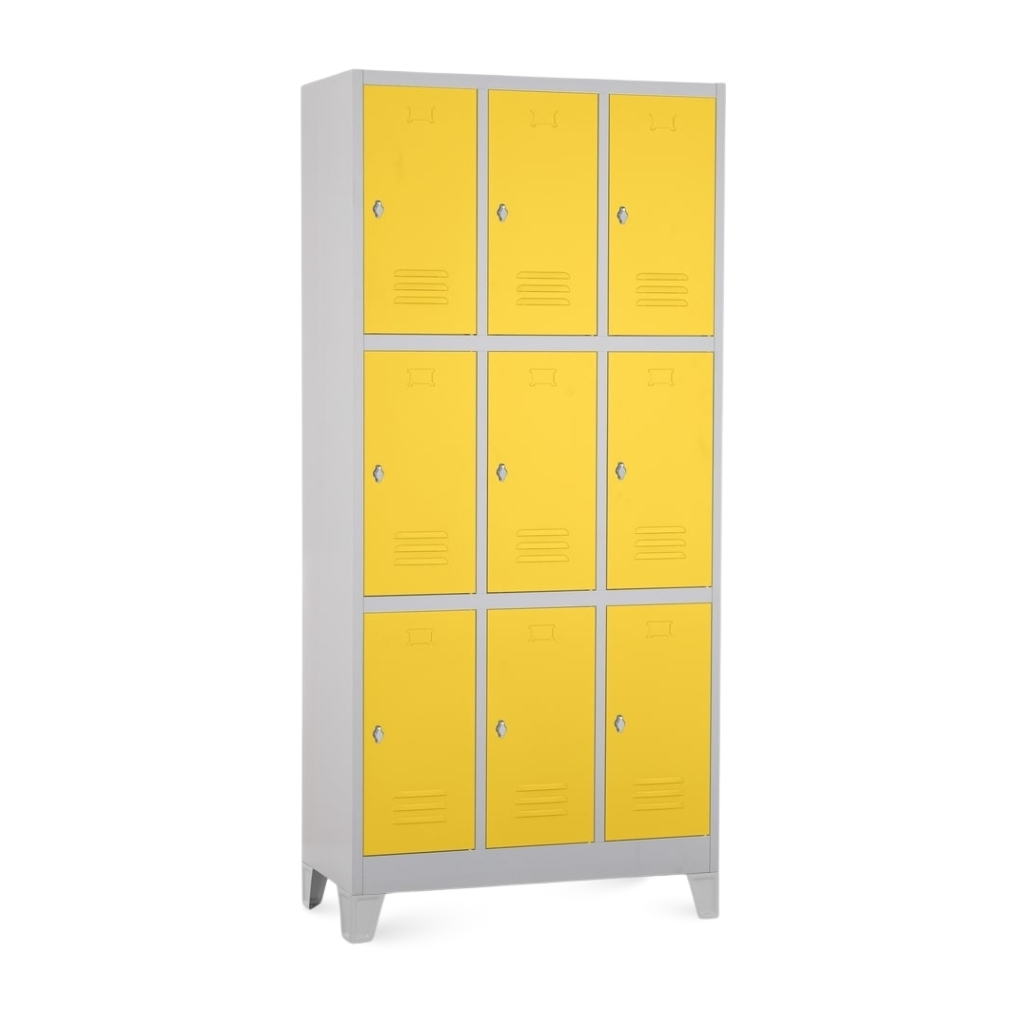 Kovová šatní skříňka disponuje 9 samostatnými boxy v rozložení 3 × 3. Každý z nich nabízí dostatek úložného prostoru pro osobní věci i oděvy.