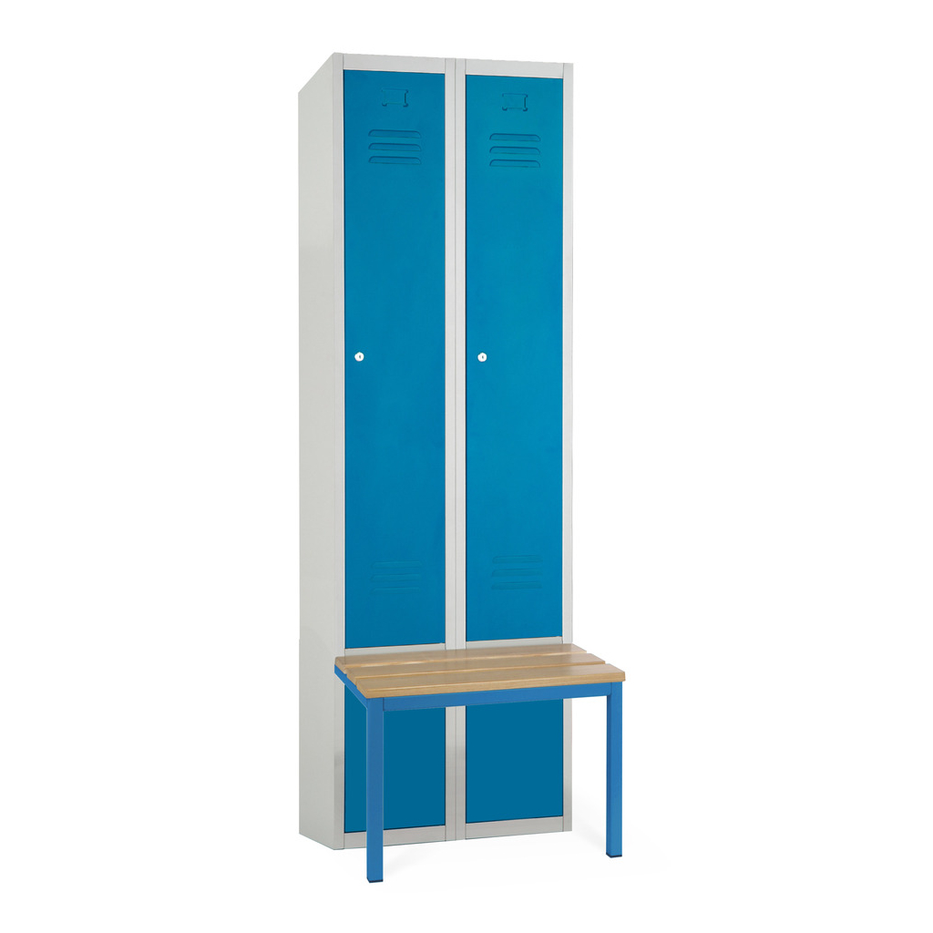 Kovová šatní skříňka s lavičkou, 60 x 85 x 185 cm, sokl, cylindrický zámek, modrá - RAL 5012
