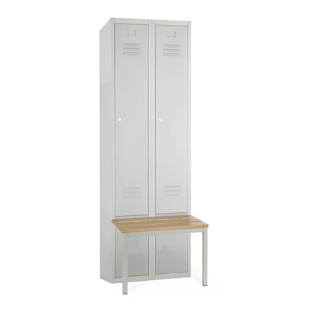 Kovová šatní skříňka s lavičkou, 60 x 85 x 185 cm, sokl, cylindrický zámek, šedá - RAL 7035 (rozbaleno)