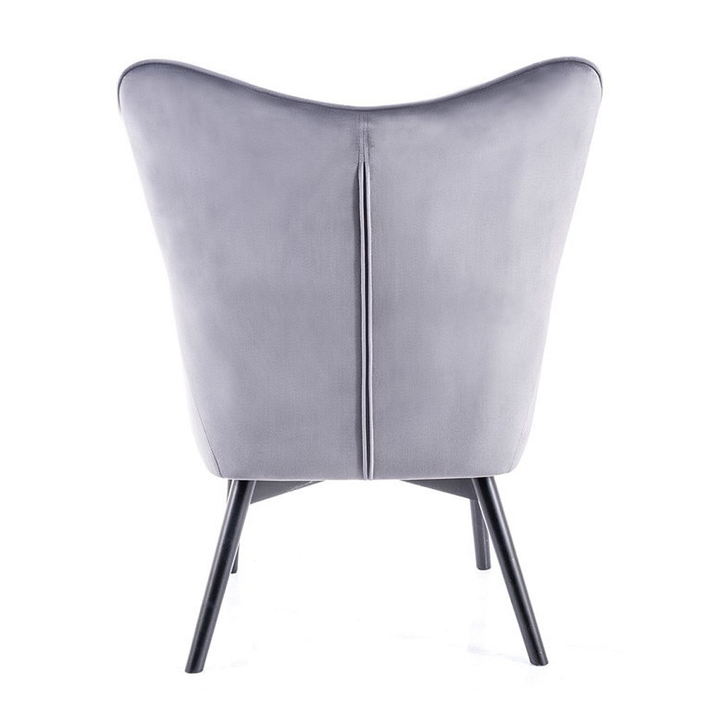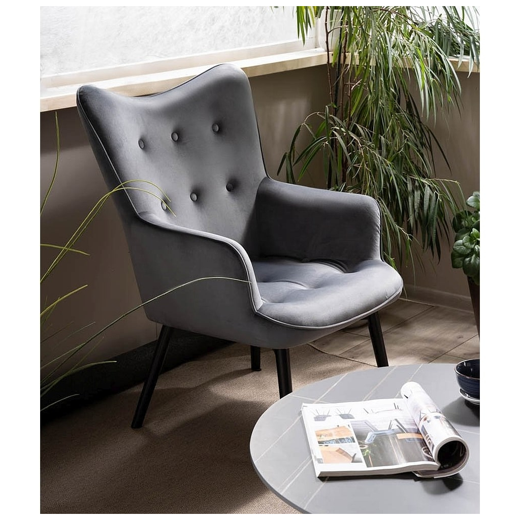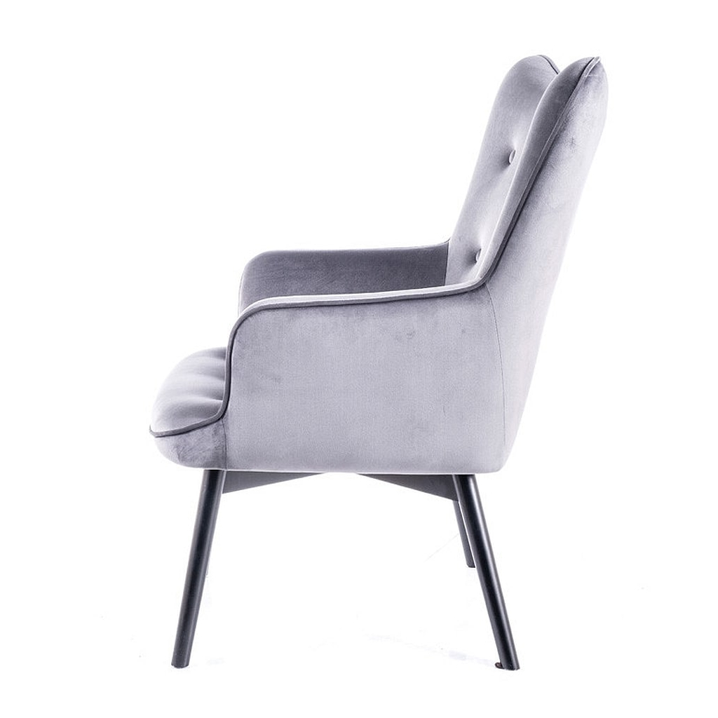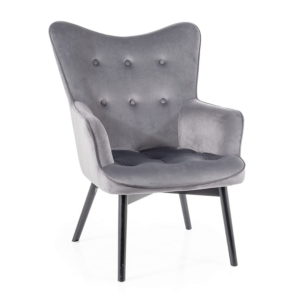 Až na nohy je celé křeslo včetně područek potažené příjemnou látkou podobnou sametu. Její vzhled ozvláštňují knoflíky na sedáku i opěradle.