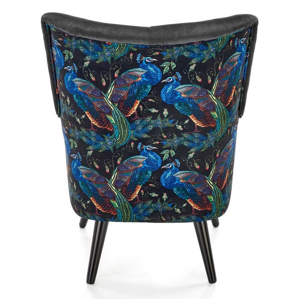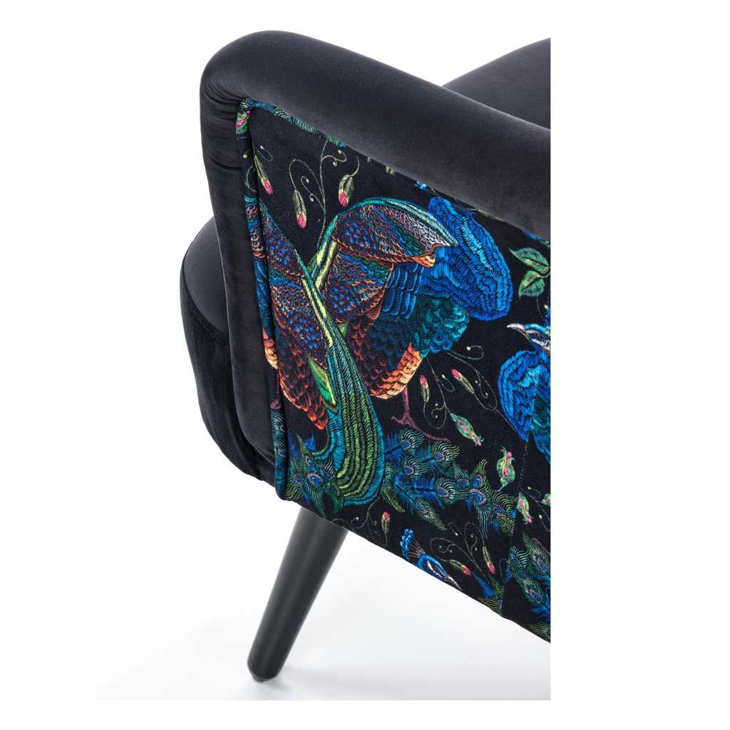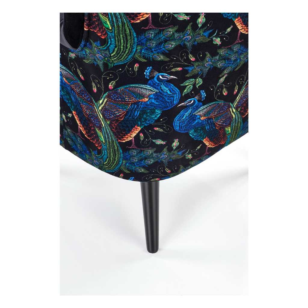 Potah sedáku je z jemné látky podobné sametu, která je příjemná na pohled i na dotyk. Záda a vnější stranu područek pak zdobí barevný vzor s motivem pávů.