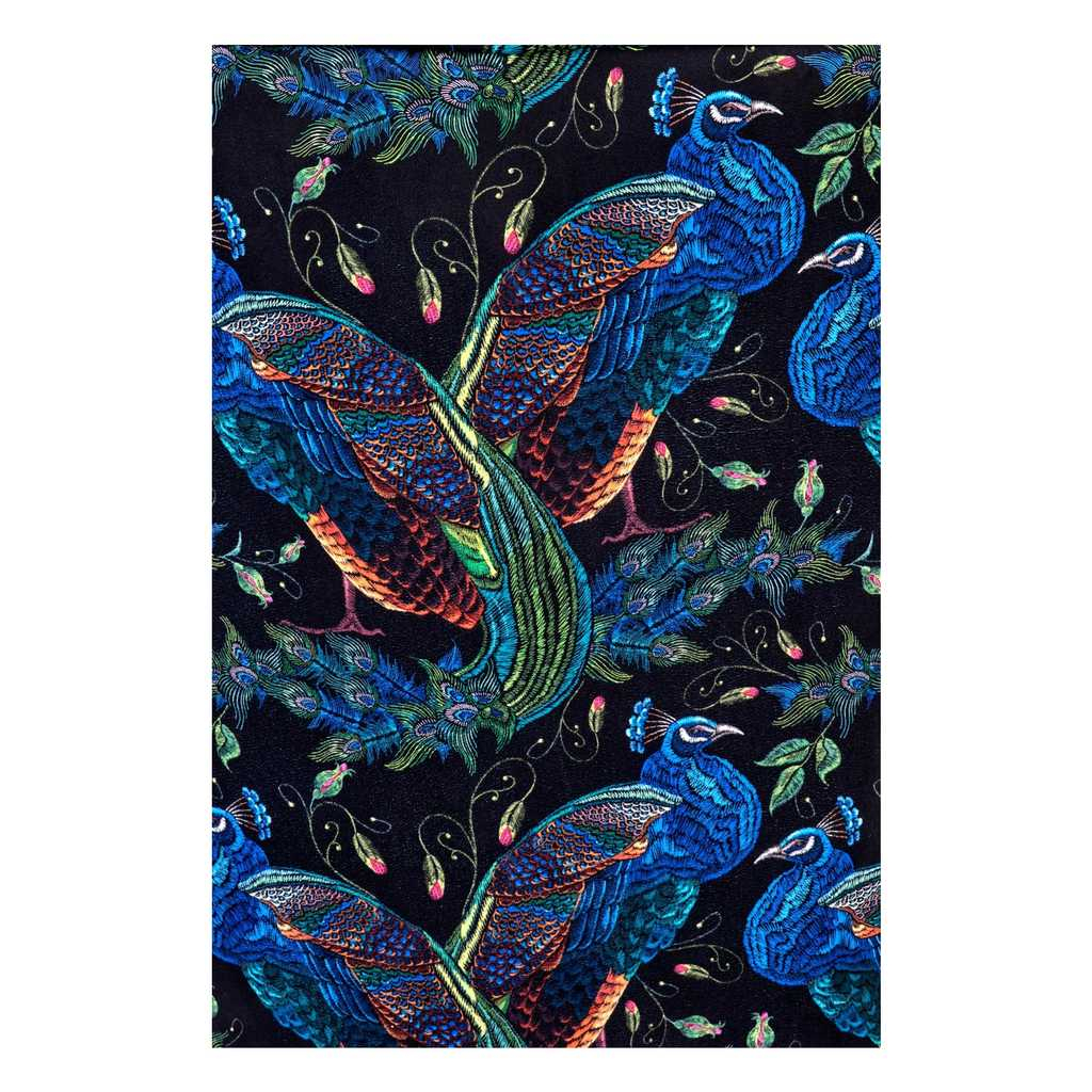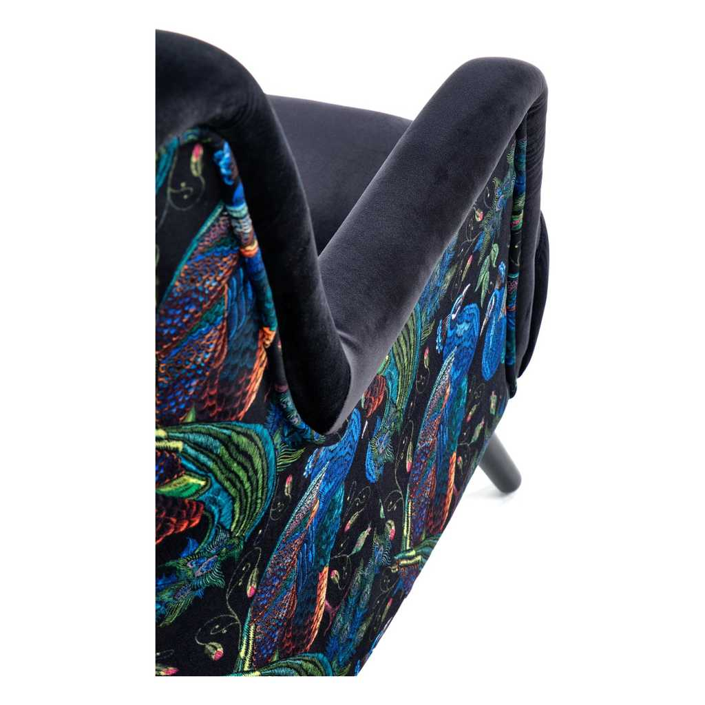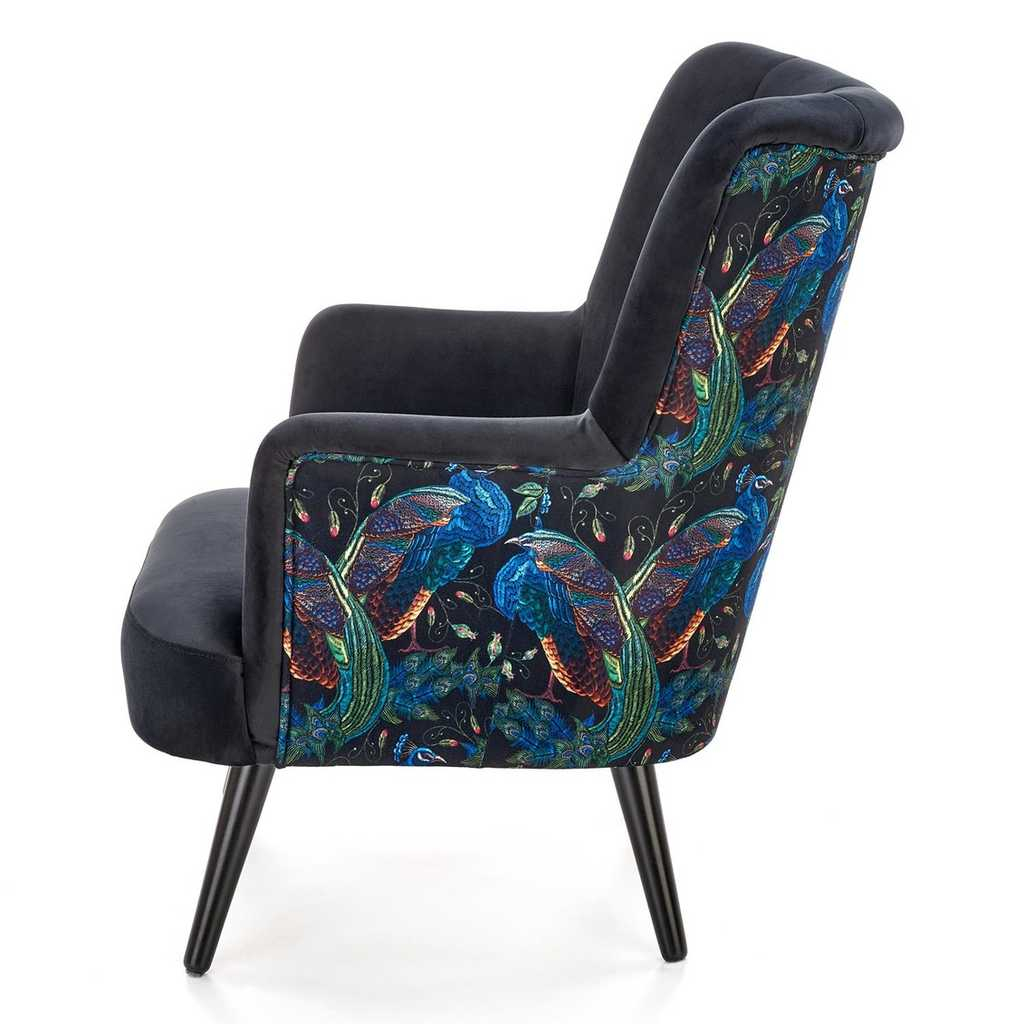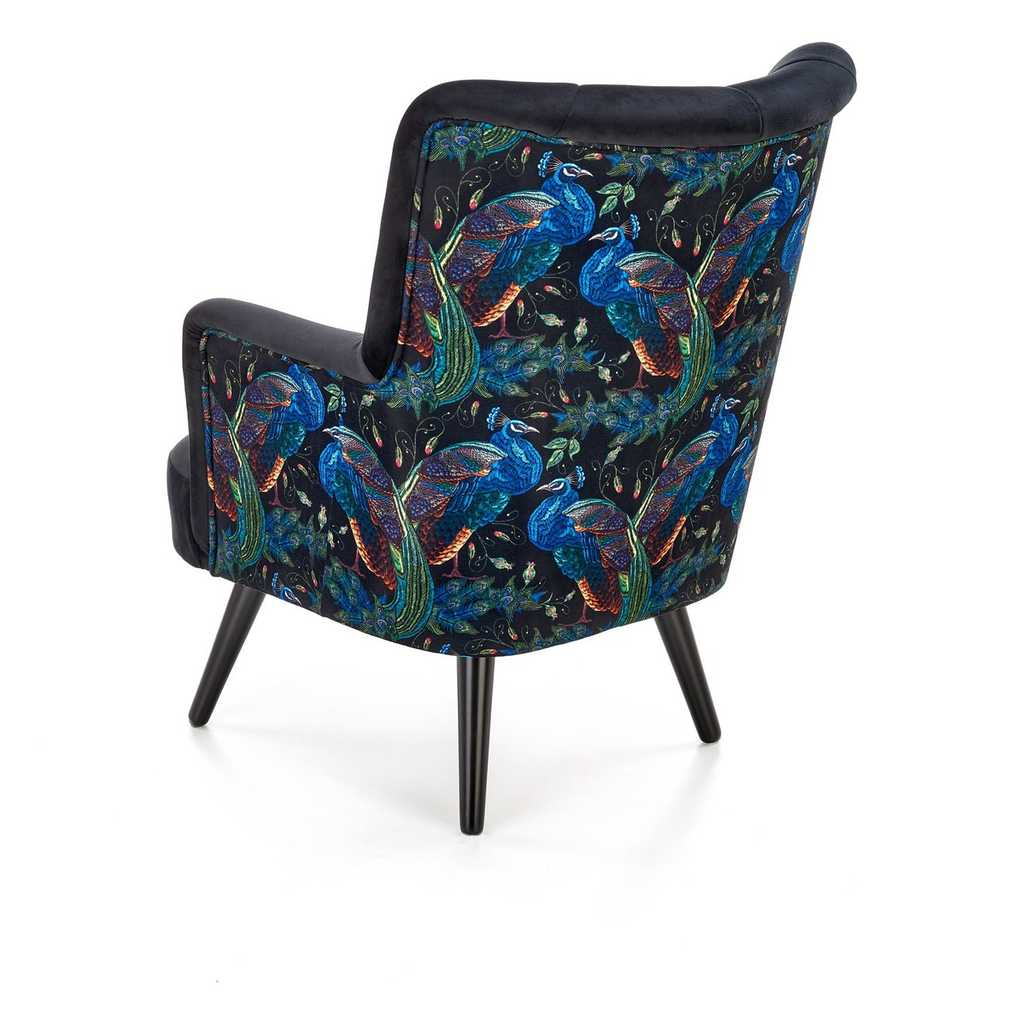 Potah sedáku je z jemné látky podobné sametu, která je příjemná na pohled i na dotyk. Záda a vnější stranu područek pak zdobí barevný vzor s motivem pávů.