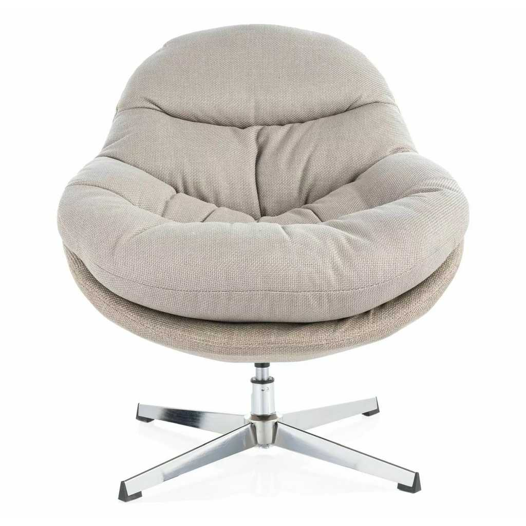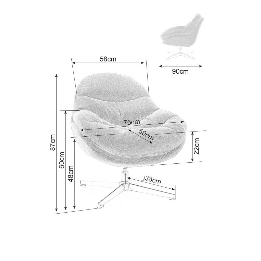 Celá sedací část je čalouněná hruběji tkanou látkou, která spolu s robustním polstrováním vybízí k usednutí. Křeslo stojí na pevné kovové podnoži, která umožňuje otočení o 360°, a zajišťuje tak maximální pohodlí a flexibilitu.