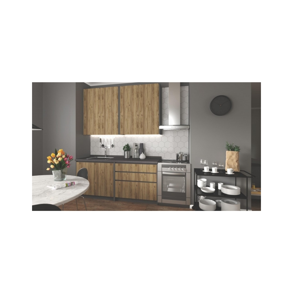Kuchyňská linka Idea nabízí praktické pracovní prostředí, které doplňuje tmavý design. Je navržena v moderní barevné kombinaci dub kraft a antracit. Kompletní sestava kuchyňské linky Idea je dlouhá 180 cm a ve svých skříních nabízí dostatek úložného prostoru pro všechny potřebné kuchyňské pomocníky. Horní závěsné skříňky mají dvojitá dvířka s panty s tlumením dovírání, což je velmi pohodlné. Jedna dolní skříňka je rovněž vybavena dvířky, druhá se skládá ze tří šuplíků s plynulým pojezdem.