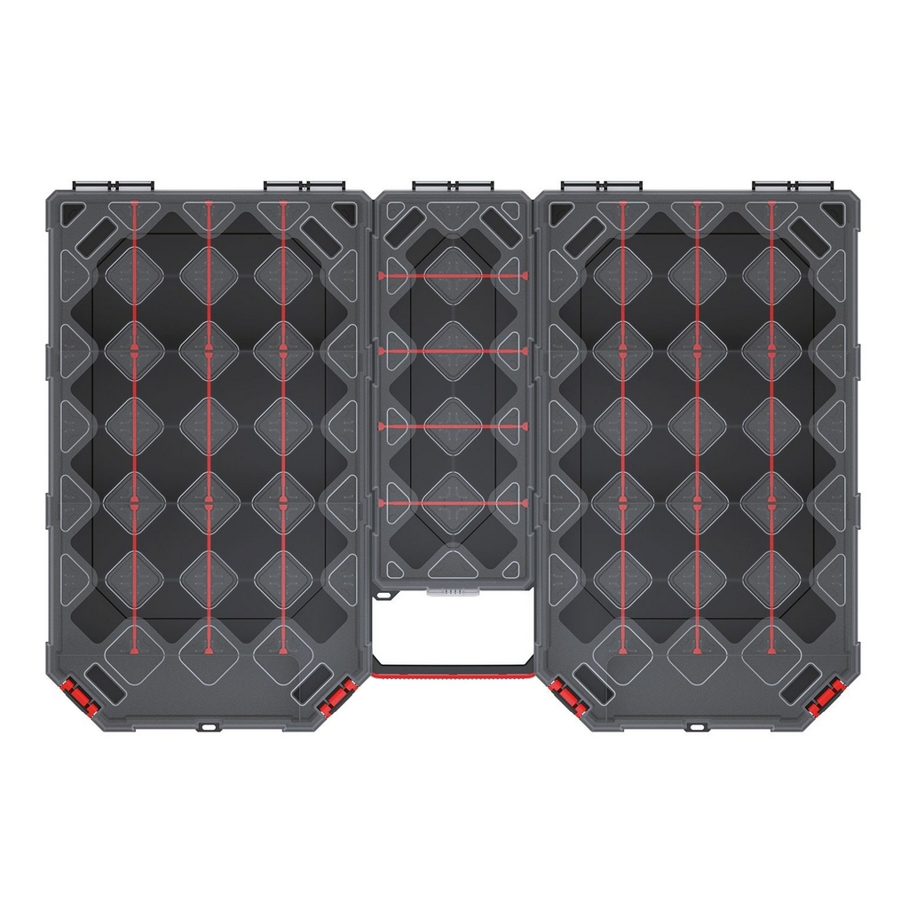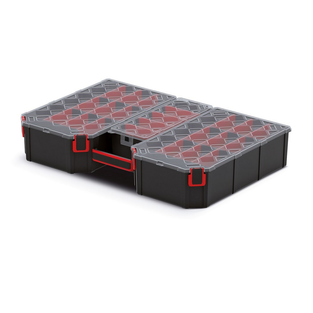 Organizéry představují praktický způsob, jak si udržet pořádek v drobnějším náčiní a součástkách a zároveň je mít vždy po ruce. Tento model je vybaven odnímatelnými přepážkami, pomocí kterých si úložný prostor přizpůsobíte přesně na míru. Průhledné víko z polypropylenu vám usnadní hledání toho správného dílu i bez nutnosti otevření.