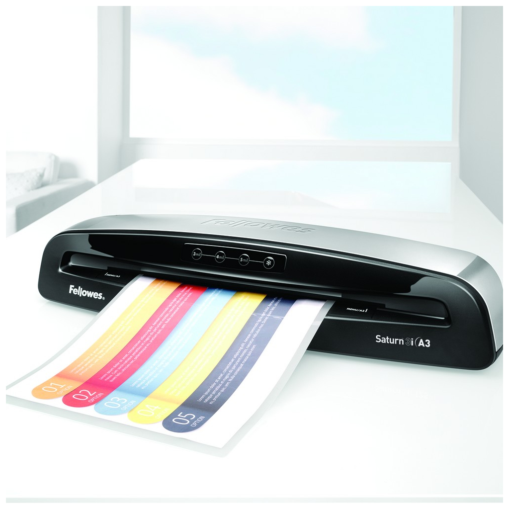 Laminátor Fellowes SATURN3i A3 vás na první pohled zaujme svým atraktivním designem a precizním provedením.