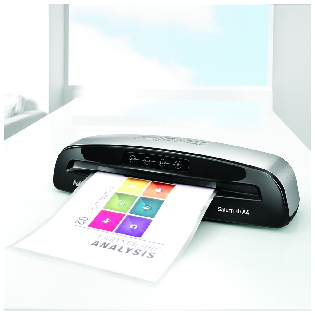 Laminátor Fellowes SATURN3i A4 se vyznačuje atraktivním designem a precizním zpracováním. Tento model je ideálním společníkem jak do vaší kanceláře, tak do domácnosti.
