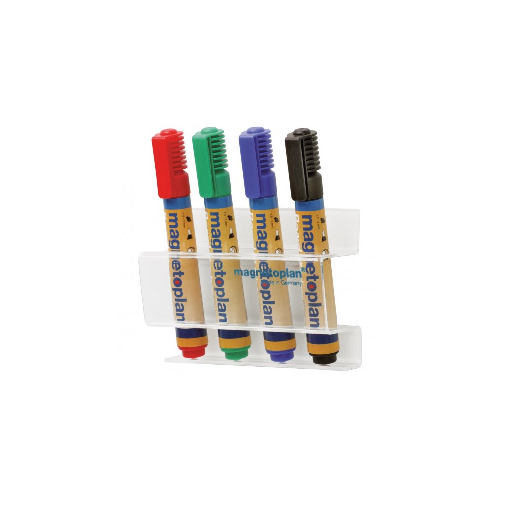 Magnetický držák popisovačů Magnetoplan je určen zejména pro magnetické tabule a flipcharty. Nabízí místo pro 4 popisovače s průměrem 2 cm a je vyroben z průhledného plastu.