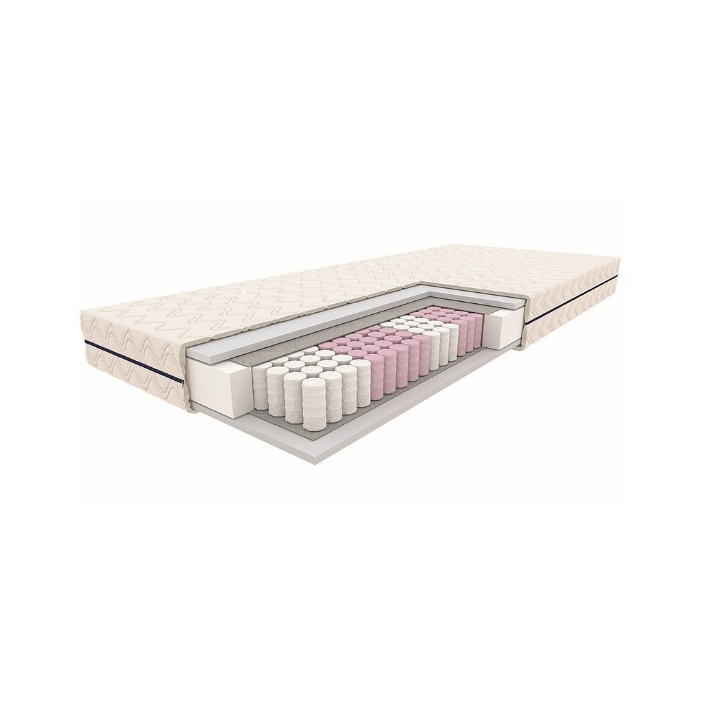 Kolem pružin je dále 2cm vrstva vysokogramážní pěny (cca 25 kg/m³) oddělená látkovou podložkou. Potah je potom z příjemné polyesterové látky prošívané hypoalergenní syntetickou vlnou – společně mají gramáž 120 g/m². Vnější vrstvu díky zipu snadno sundáte a vyperete na šetrný program.