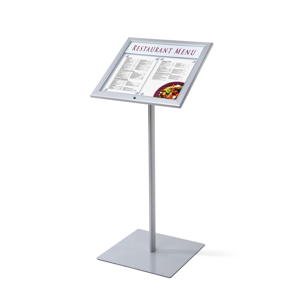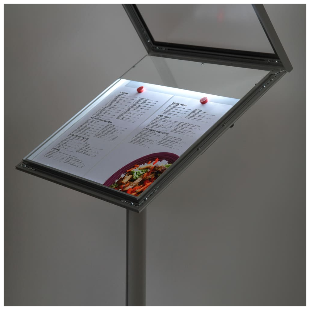Menuboard s LED vitrínou je výborným řešením pro prezentaci informací či vystavení důležitých tiskovin na viditelném místě, a to nejen v oblasti restaurací. Menuboard je se svou pevnou hliníkovou konstrukcí a elegantním designem vhodný jak do interiérů, tak i do venkovních prostorů. Je velmi odolný, a to nejen proti nepříznivému počasí, ale také proti mechanickému poškození. Disponuje rozšířenou základnou, která zajišťuje výbornou stabilitu celé konstrukci. Navíc je ve své horní části vybavena topkartou, která pomůže zvýraznit vybrané logo nebo prezentovaný obsah.