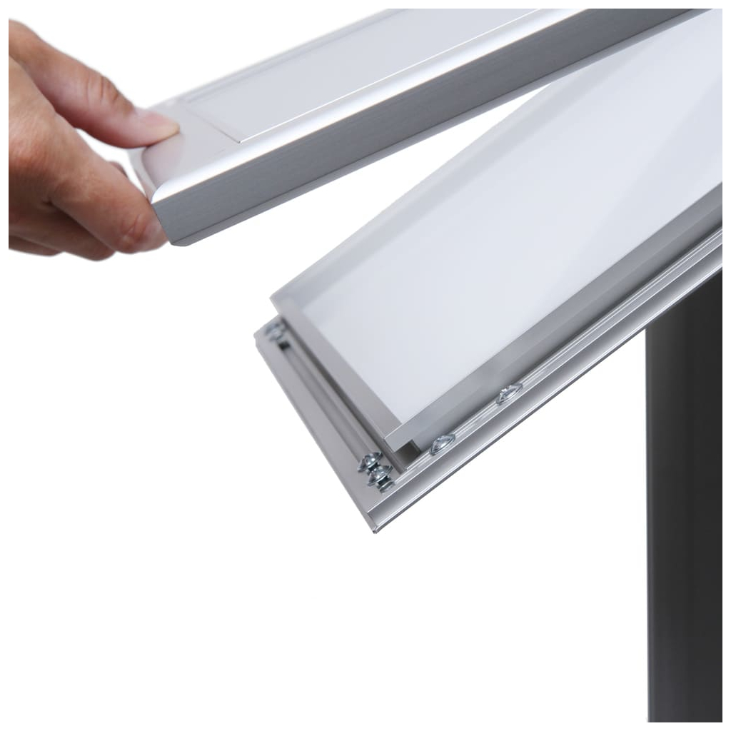 Menuboard s vitrínou je výborným řešením pro prezentaci informací či vystavení důležitých tiskovin na viditelném místě, a to nejen v oblasti restaurací. Menuboard je se svou pevnou hliníkovou konstrukcí a elegantním designem vhodný jak do interiérů, tak i do venkovních prostorů. Je velmi odolný, a to nejen proti nepříznivému počasí, ale také proti mechanickému poškození. Disponuje rozšířenou základnou, která zajišťuje výbornou stabilitu celé konstrukci. Navíc je ve své horní části vybavena topkartou, která pomůže zvýraznit vybrané logo nebo prezentovaný obsah.