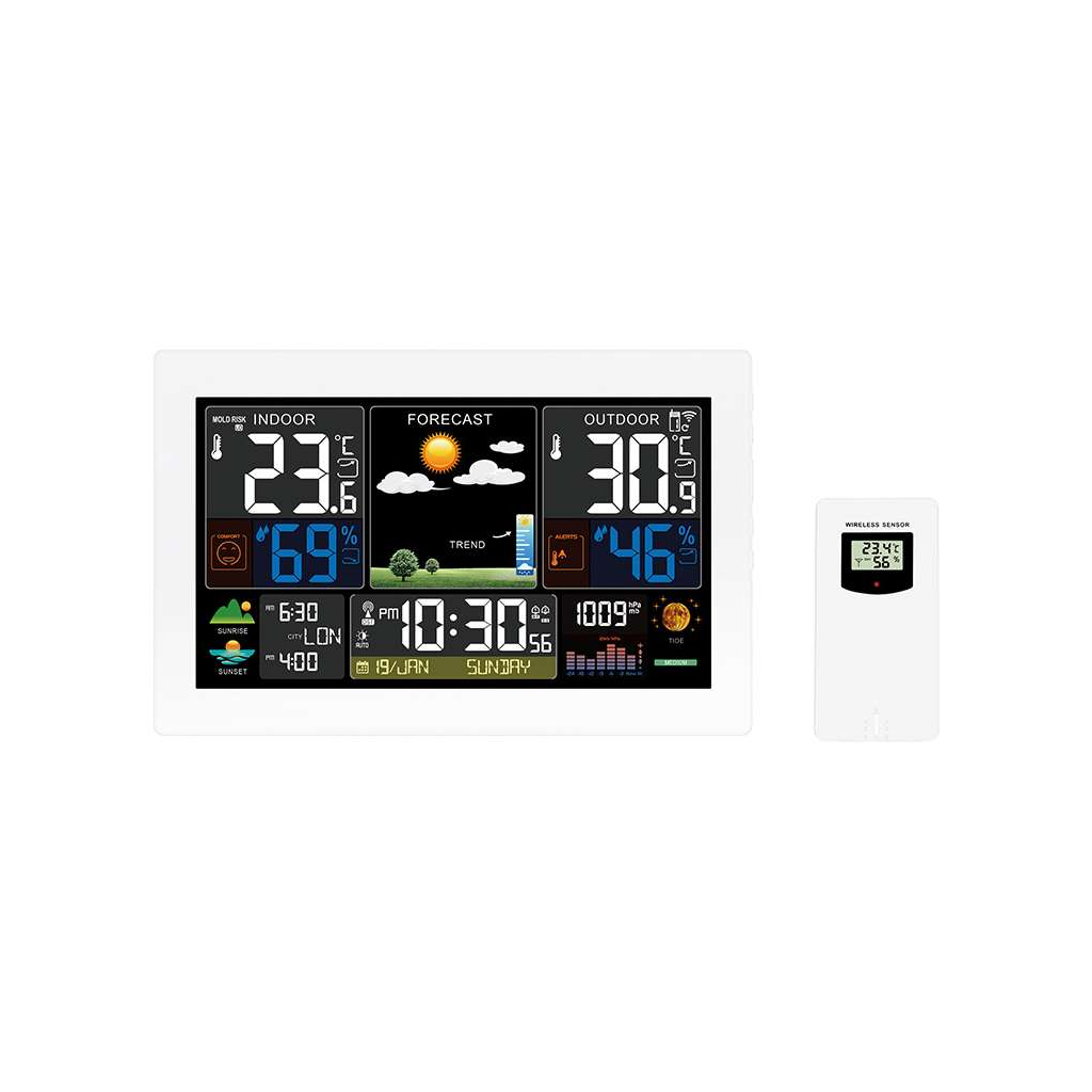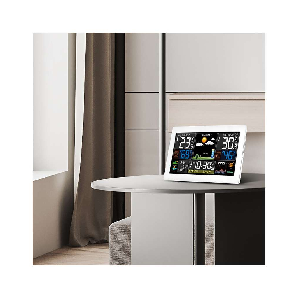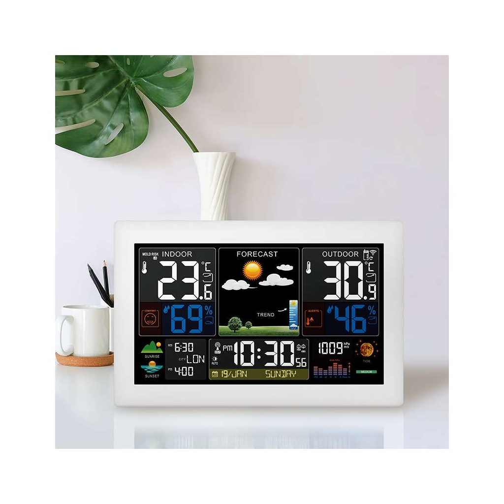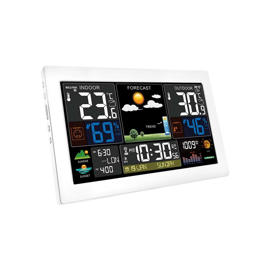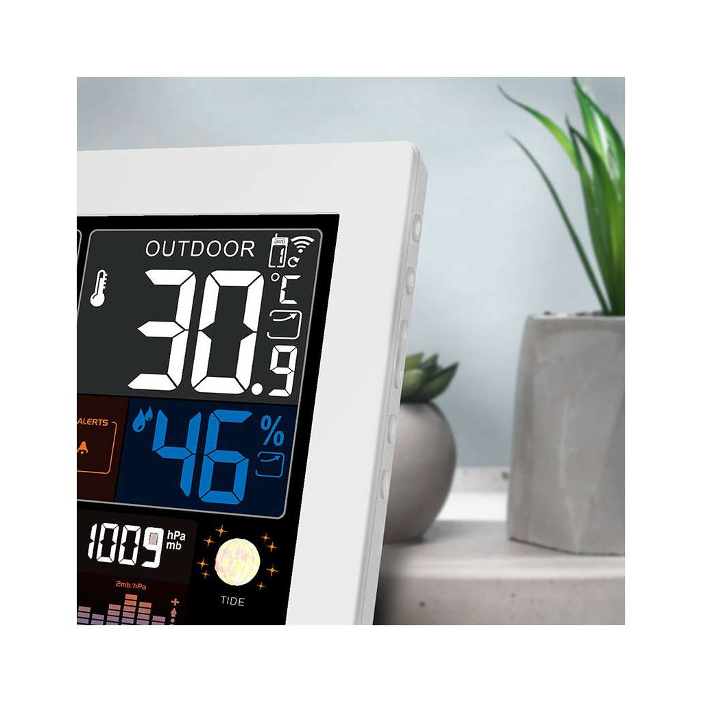 Tato meteostanice sleduje nejen venkovní i vnitřní teploty v širokém rozsahu, ale i vlhkost, tlak vzduchu a nabízí také barevnou předpověď počasí v několika úrovních. Užitečné jsou i doplňkové funkce, jako jsou indikace fází Měsíce, východu a západu Slunce, či praktický kalendář s rádiově řízeným časem. Díky možnosti připojení až tří bezdrátových senzorů můžete měřit teplotu i ve více místech.