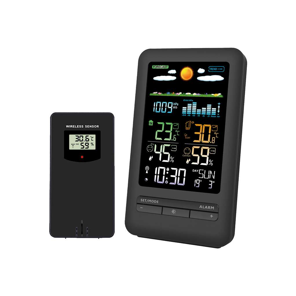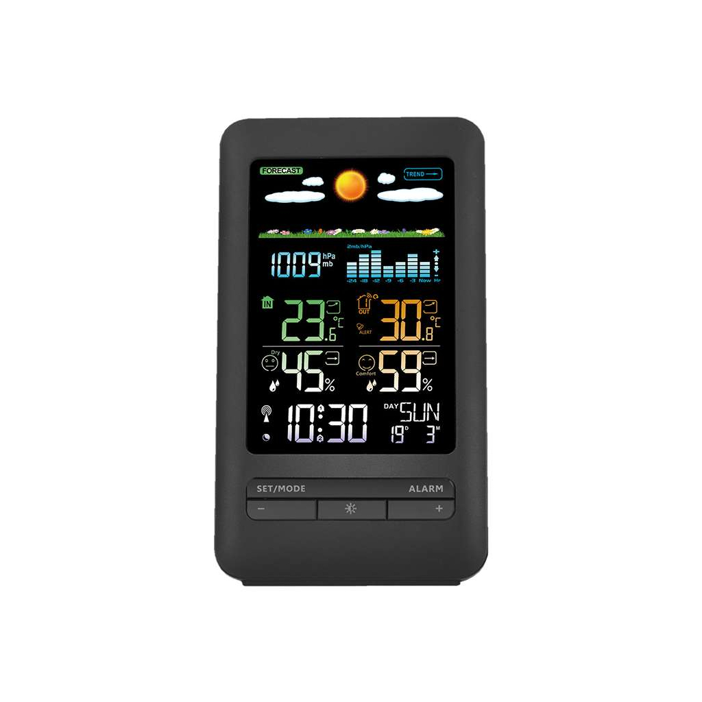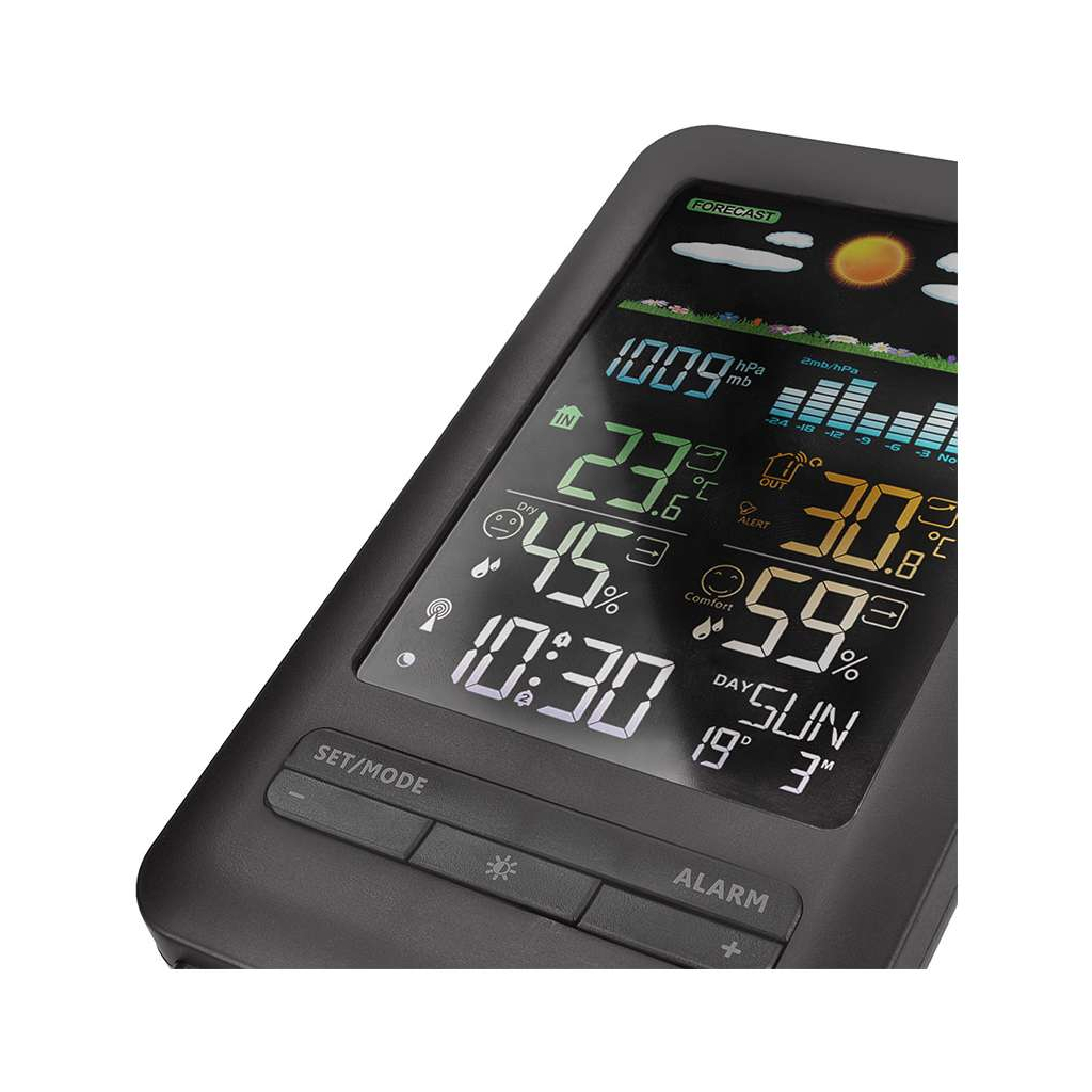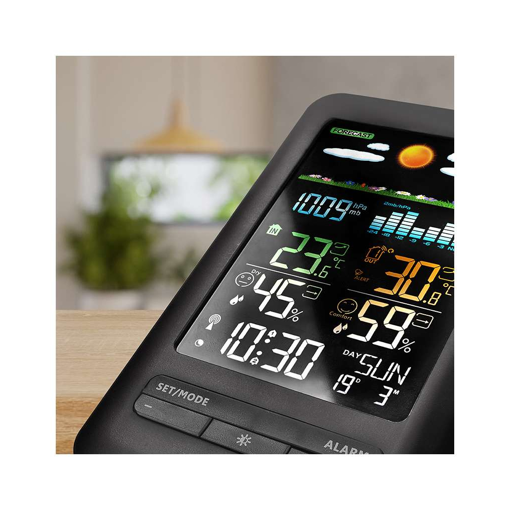 Tato meteostanice nabízí komplexní měření, které zahrnuje vnitřní i venkovní teplotu v širokém rozsahu, vlhkost vzduchu a barometrický tlak pro lepší předpověď počasí. Upozornění na nastavenou venkovní teplotu a možnost námrazy vám pomůže včas reagovat na změny počasí.