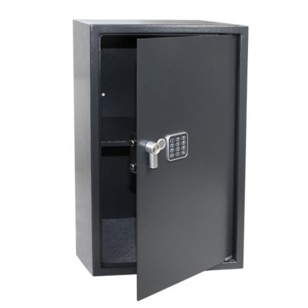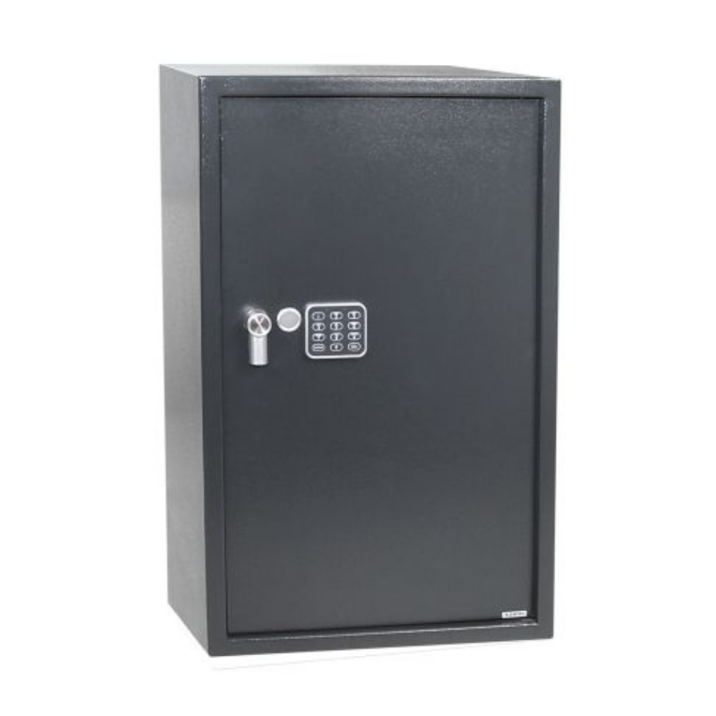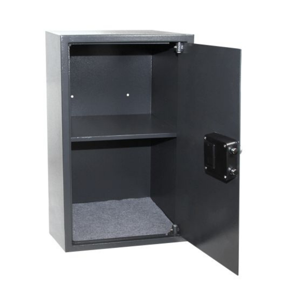 Ocelový sejf s elektronickým zámkem na číslenou kombinaci a páčkou k snadnému otevírání.