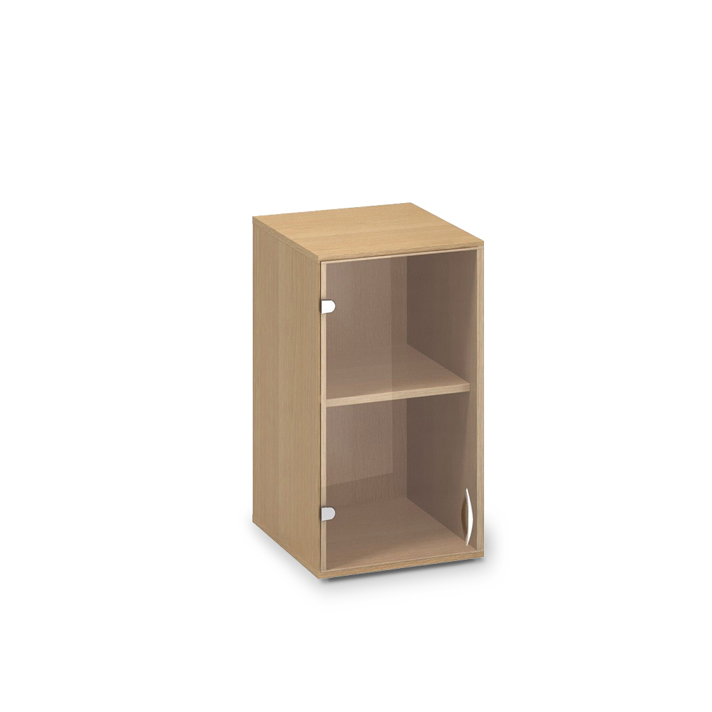 Tento typ skříně dodáváme se skleněnými křídlovými dveřmi, které jsou vybaveny kovovou úchytkou.