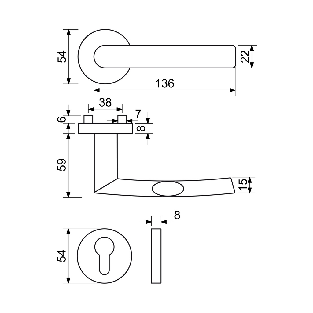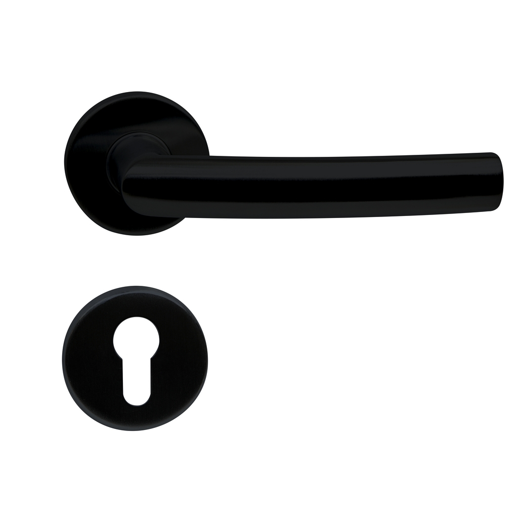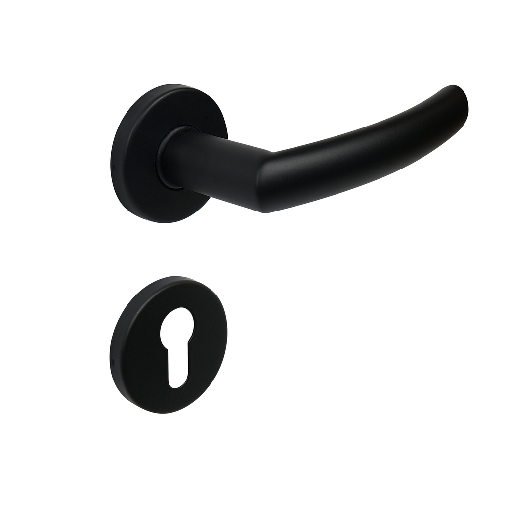 Dveřní kování na kulatých rozetách představuje moderní klasiku, která neurazí v žádném interiéru. Tento model nabízí konfiguraci klika + klika a rozetu s výřezem na cylindrickou vložku.