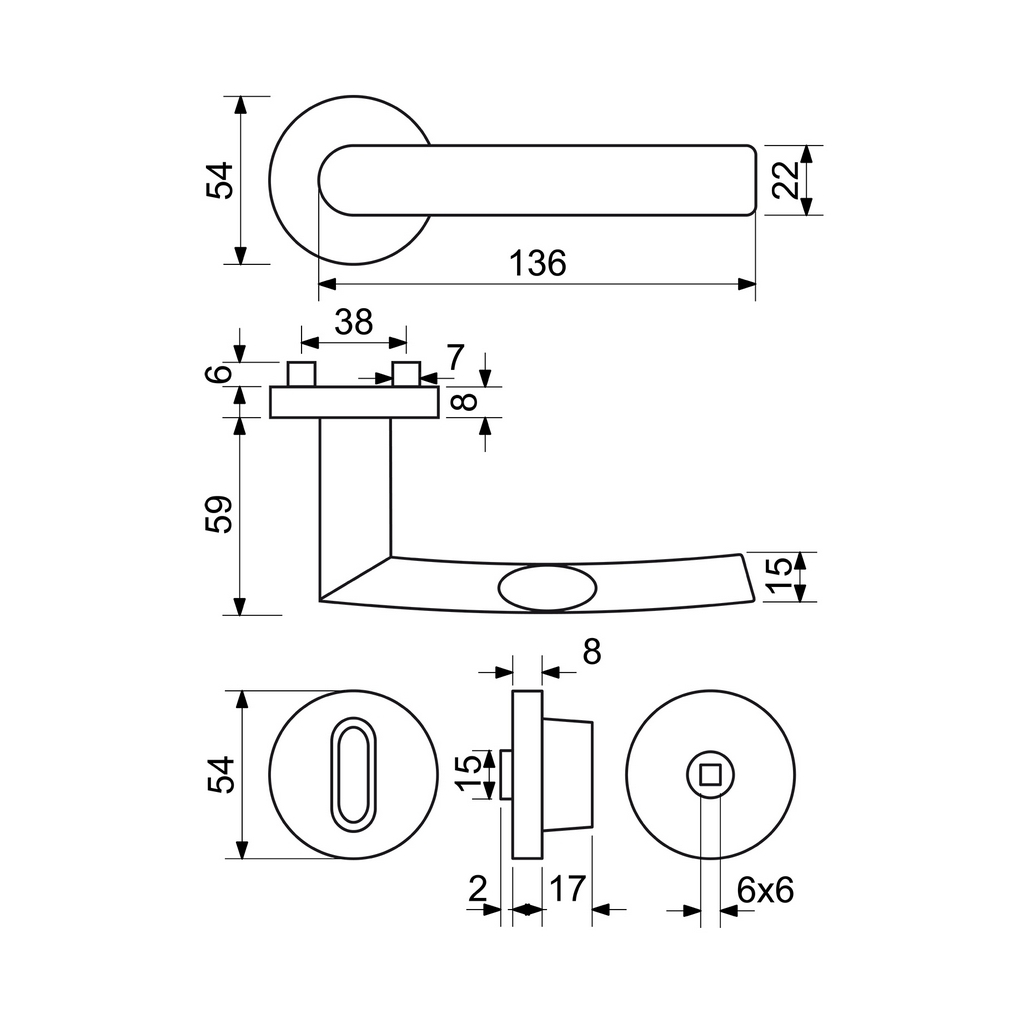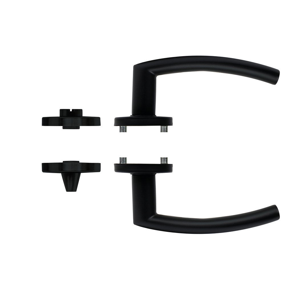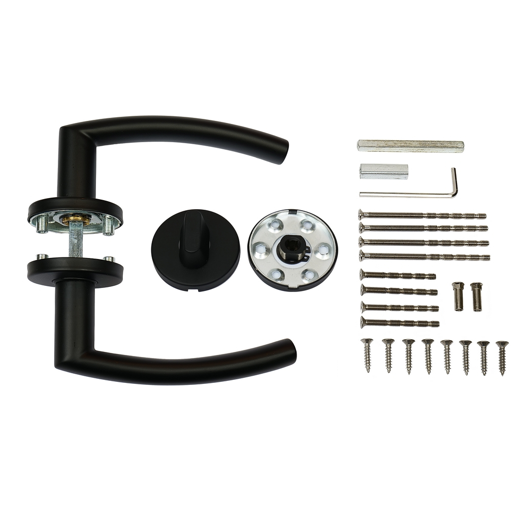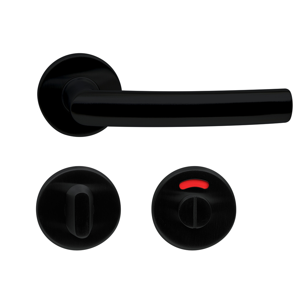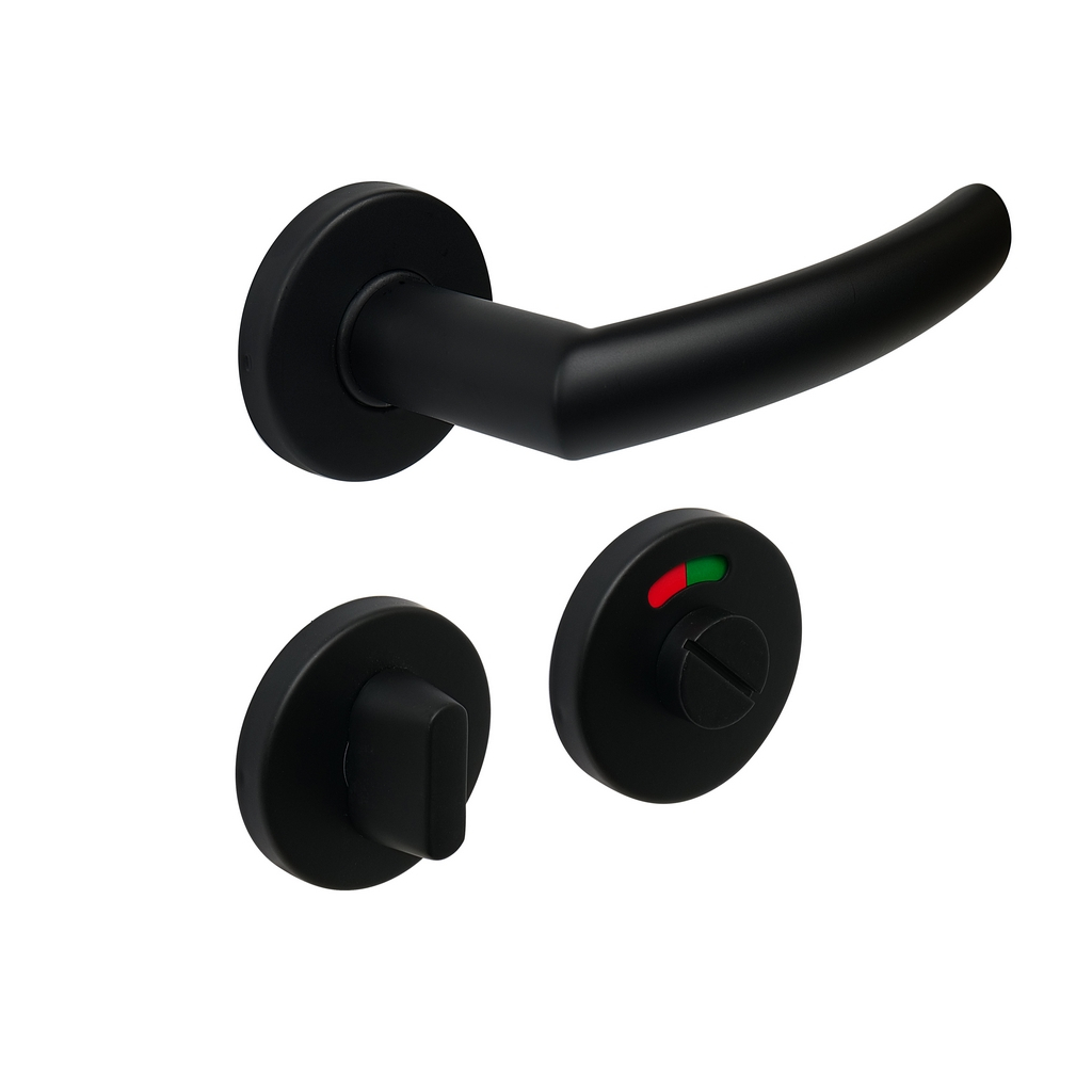 Dveřní kování na kulatých rozetách představuje moderní klasiku, která neurazí v žádném interiéru. Tento model nabízí konfiguraci klika + klika a zamykací mechanismus určený např. pro WC či zkušební kabinky.