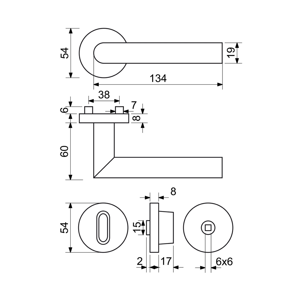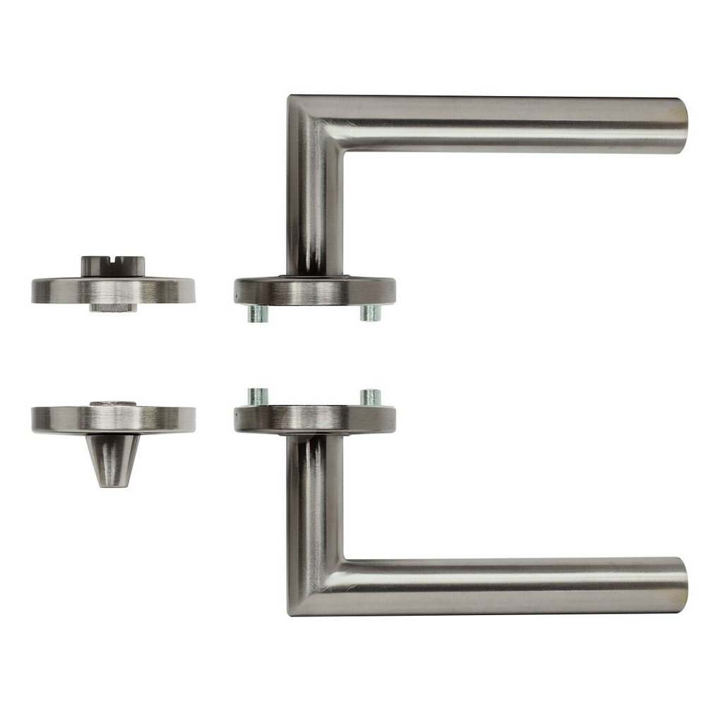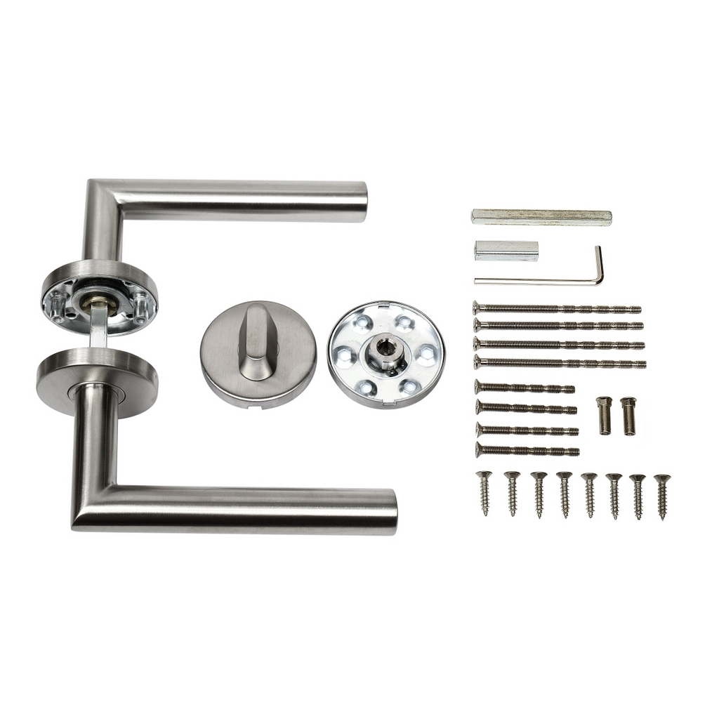 Dveřní kování na kulatých rozetách představuje moderní klasiku, která neurazí v žádném interiéru. Tento model nabízí konfiguraci klika + klika a zamykací mechanismus určený např. pro WC či zkušební kabinky.