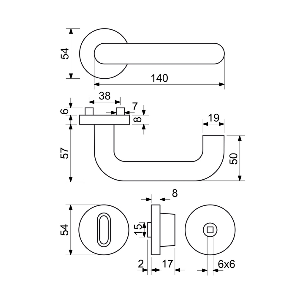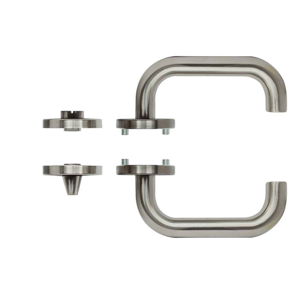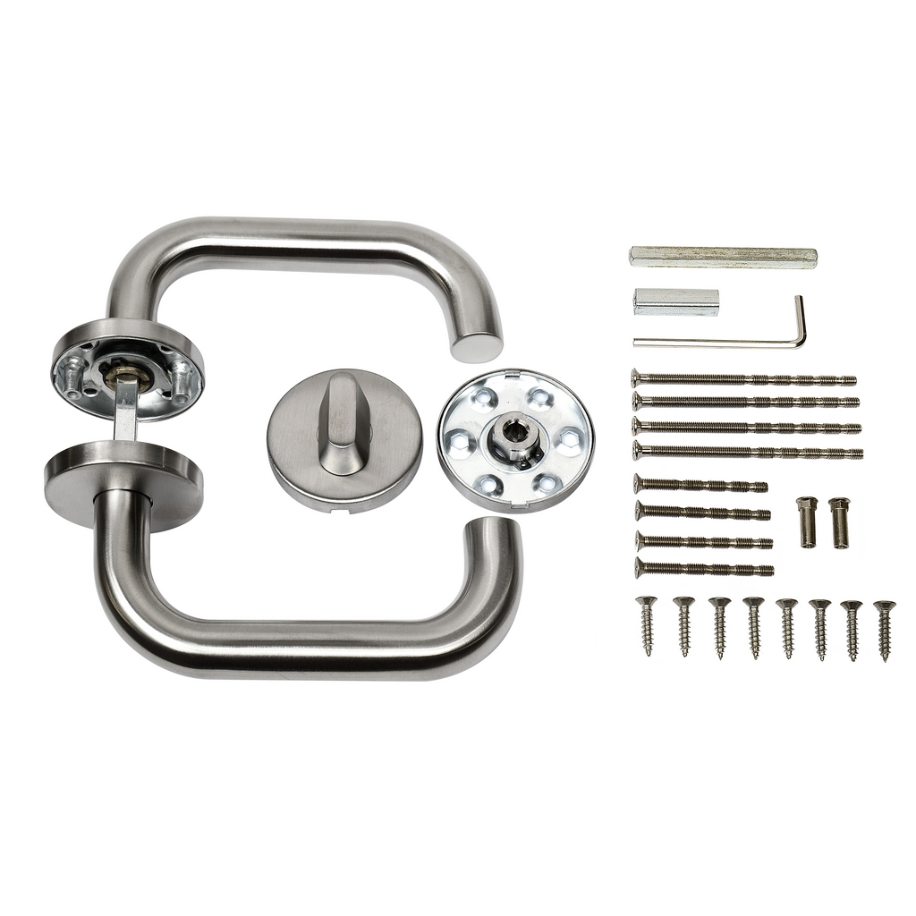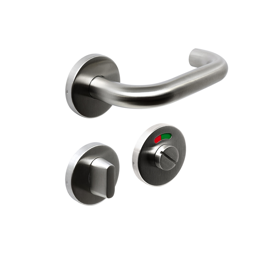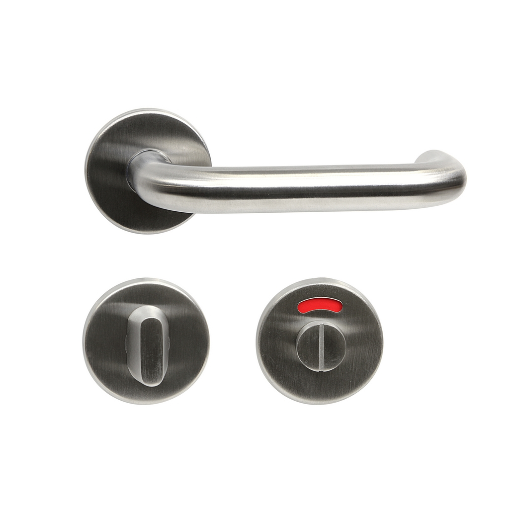 Dveřní kování na kulatých rozetách představuje moderní klasiku, která neurazí v žádném interiéru. Tento model nabízí konfiguraci klika + klika a zamykací mechanismus určený např. pro WC či zkušební kabinky.