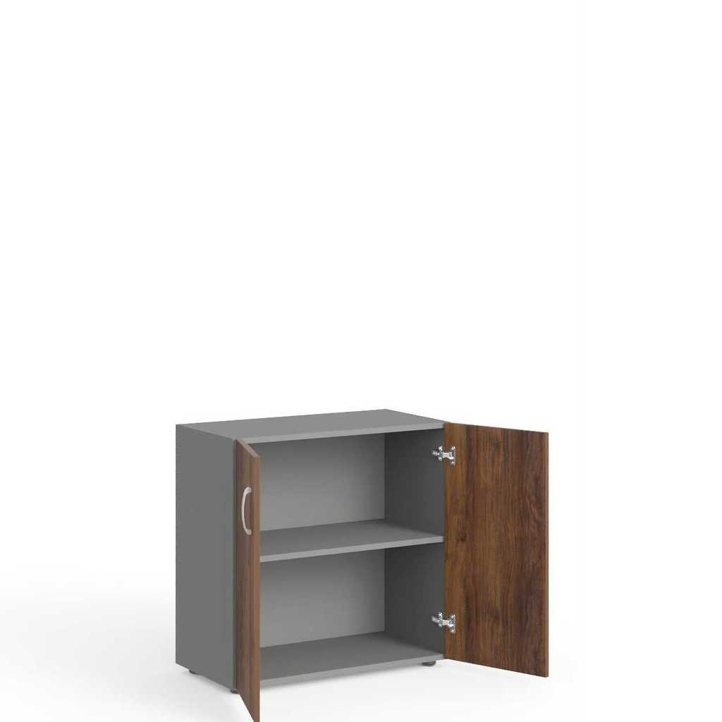 Skříň je dodávána společně s dřevěnými dveřmi, které jsou vybaveny plastovými úchytkami. Pro sjednocení elegantního vzhledu vaší kanceláře si můžete objednat obkladovou desku.