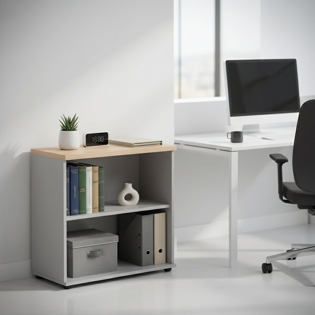Skříně Visio LUX nabízíme ve dvou dezénech, které vám zaručí jednotný vzhled vaší kanceláře. Boky a záda skříně jsou v elegantní šedé barvě.