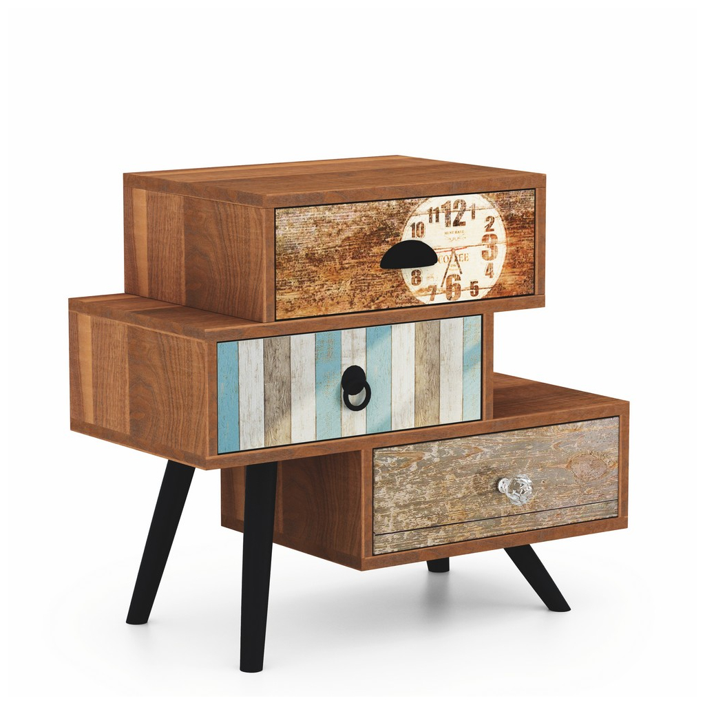 Disponuje 3 šuplíky s rozmanitým dekorem a úchytkami. Nabízí tak dostatek úložného prostoru pro vaše drobnosti.