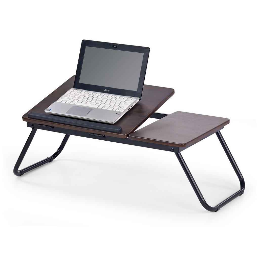 Stolek Sylvester je skvělým řešením pro váš notebook v případě, že dáváte přednost brouzdání po internetu z pohodlí postele či pohovky. Své zařízení nemusíte pokládat na lůžkoviny a tím riskovat jeho přehřátí. Deska stolečku je vyrobena z laminované dřevotřísky v odstínu tmavého ořechu a její sklon si můžete kdykoliv sami přizpůsobit pomocí páčky na spodní straně desky stolku, a to celkem do 4 úhlů. Pevná konstrukce z lakované oceli se postará o celkovou stabilitu.