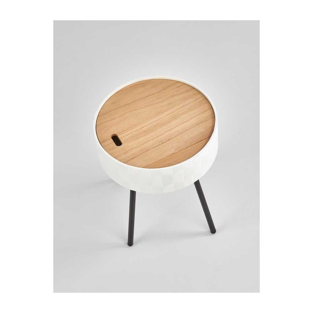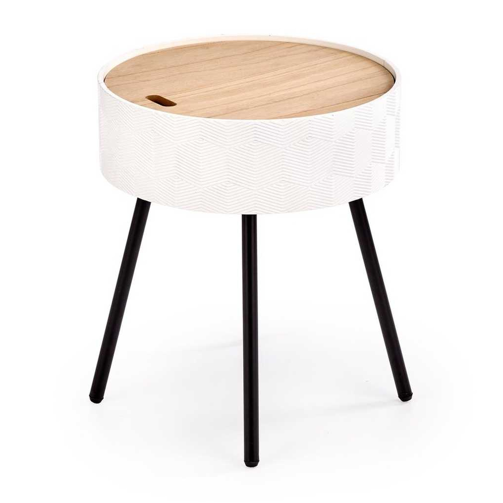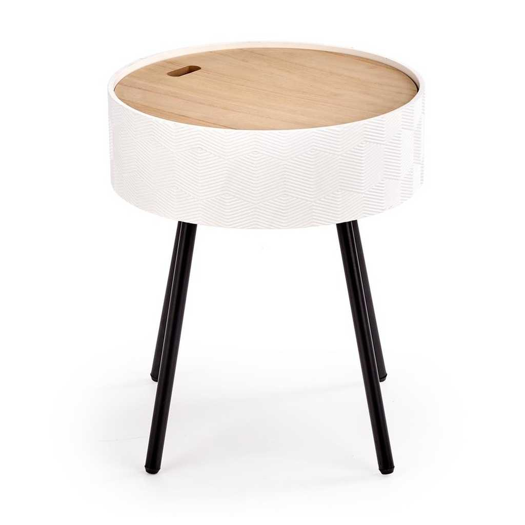 Odkládací stolek je kulatého tvaru, má ale praktický úložný prostor, k němuž se dostanete odklopením horní desky. Stolek je vyroben převážně z MDF (obvod je lakovaný, víko dýhované), nohy jsou pak z práškované ocele. Vkusná kombinace barev se neztratí ani ve skandinávském interiéru.
