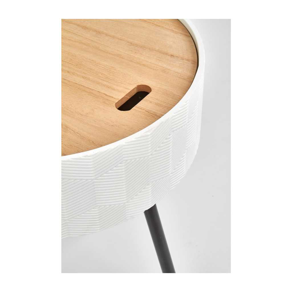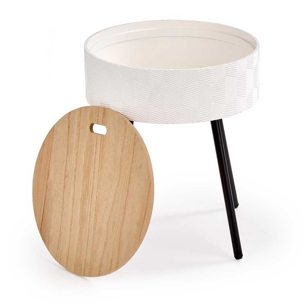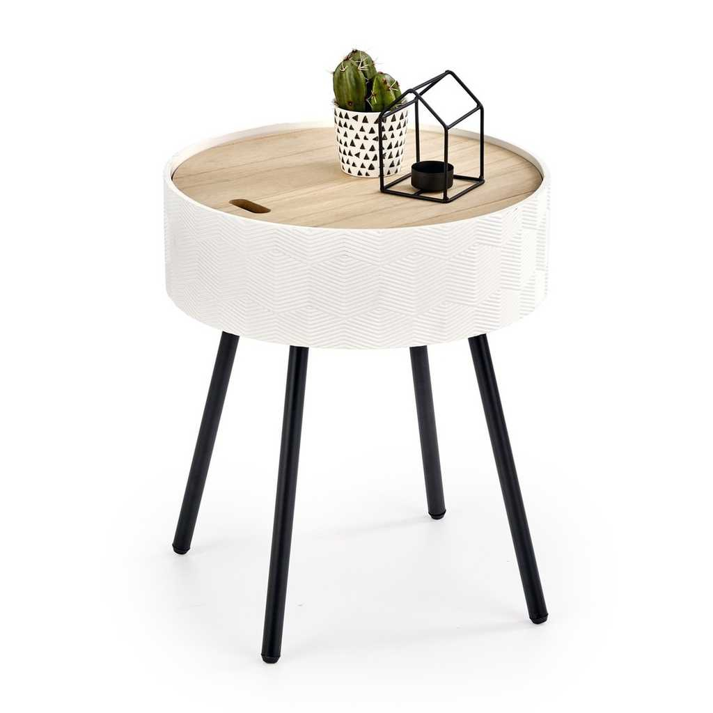 Odkládací stolek je kulatého tvaru, má ale praktický úložný prostor, k němuž se dostanete odklopením horní desky. Stolek je vyroben převážně z MDF (obvod je lakovaný, víko dýhované), nohy jsou pak z práškované ocele. Vkusná kombinace barev se neztratí ani ve skandinávském interiéru.