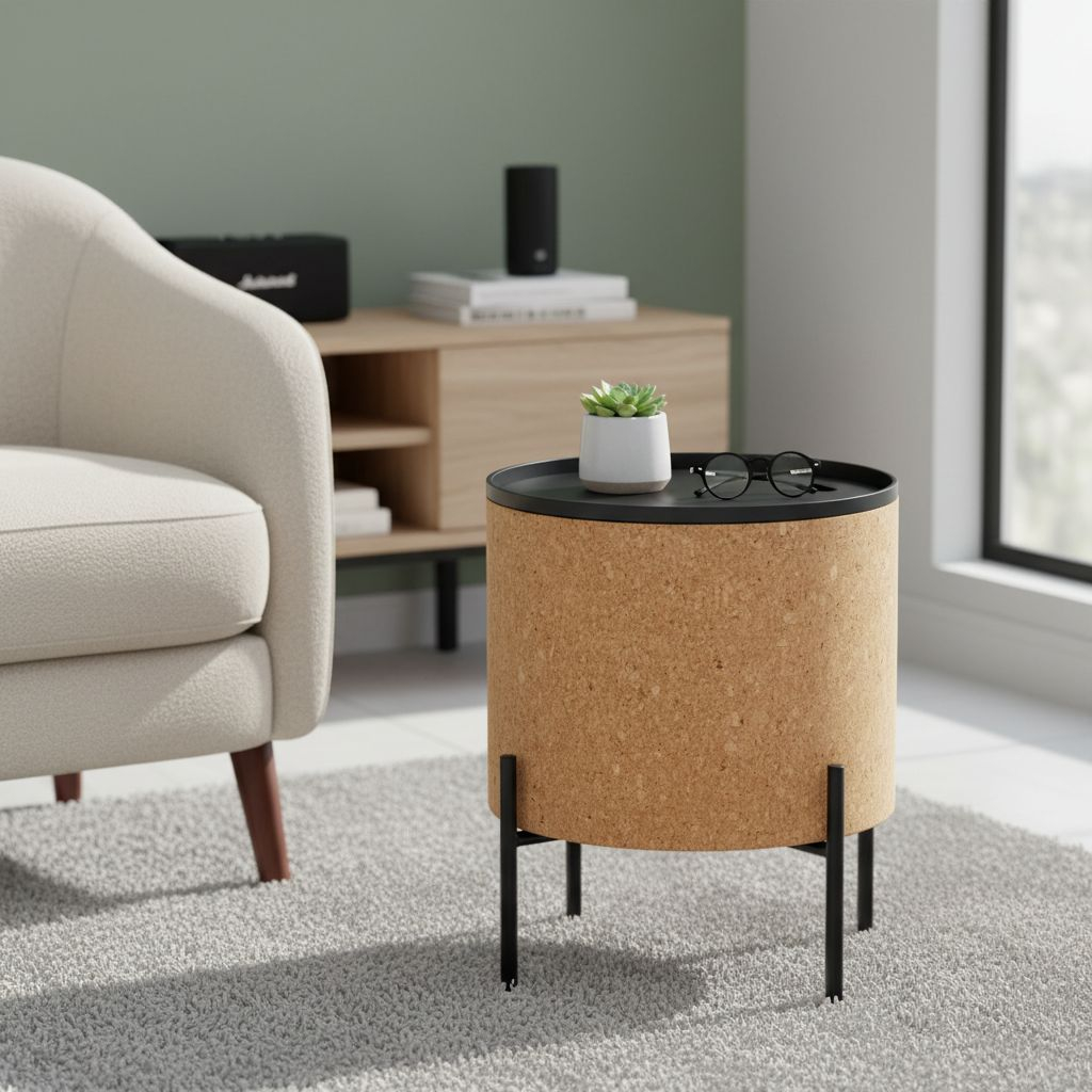 Odkládací stolek je kulatého tvaru, má ale praktický úložný prostor, k němuž se dostanete odklopením horní desky. Specifikem stolku je konstrukce z kombinace MDF a korku. Nožky jsou z práškované oceli a zajišťují stolku pevnost a stabilitu.