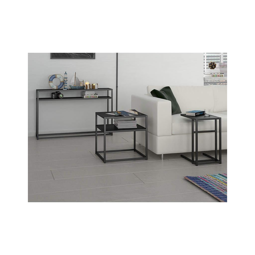 Laminátová vrchní deska, ležíc na kovové konstrukci s obdélníkovou základnou, vytvoří praktické místo pro odložení drobností. Navíc díky posunutým nohám můžete základnu stolku zastrčit pod pohovku nebo postel a mít tak vše po ruce.