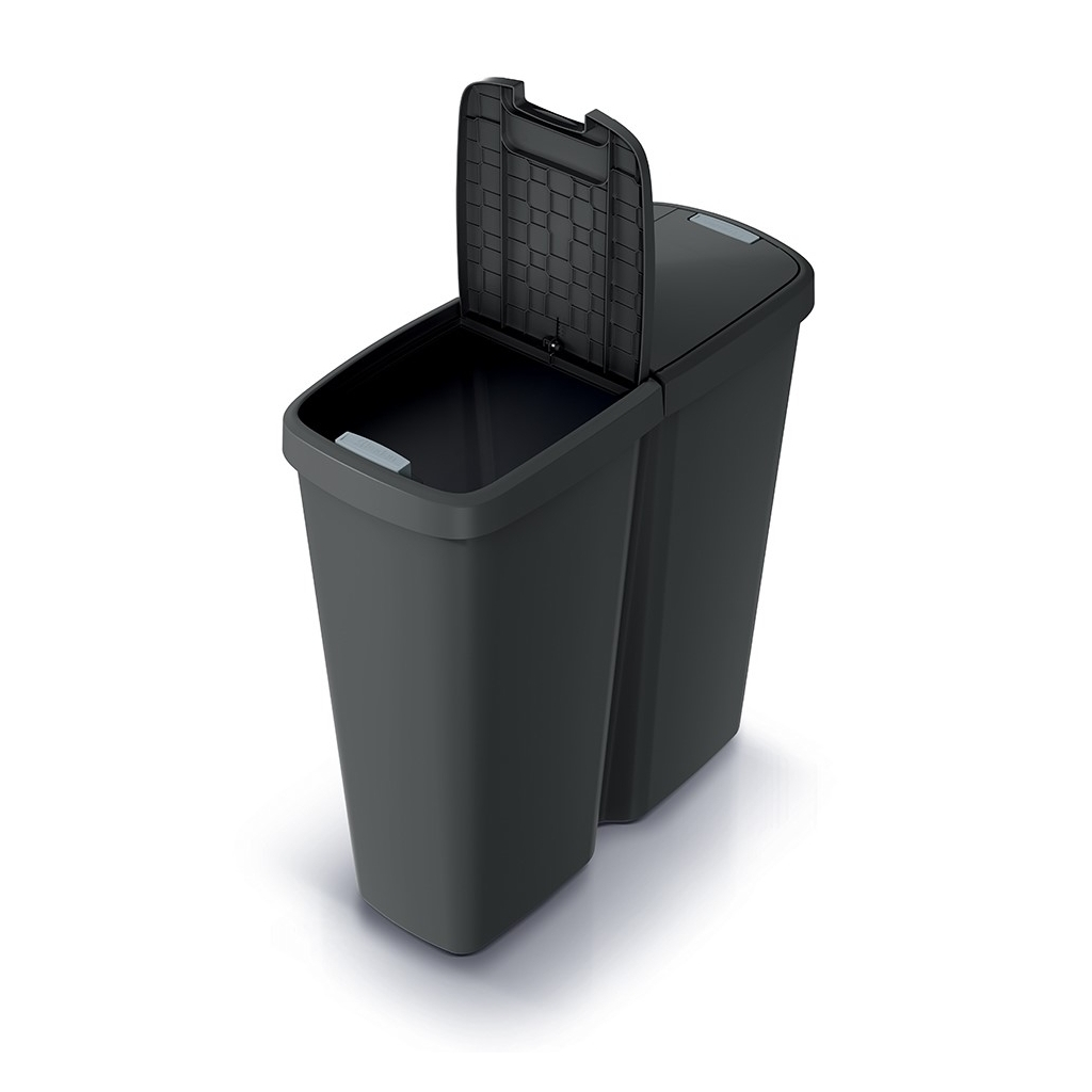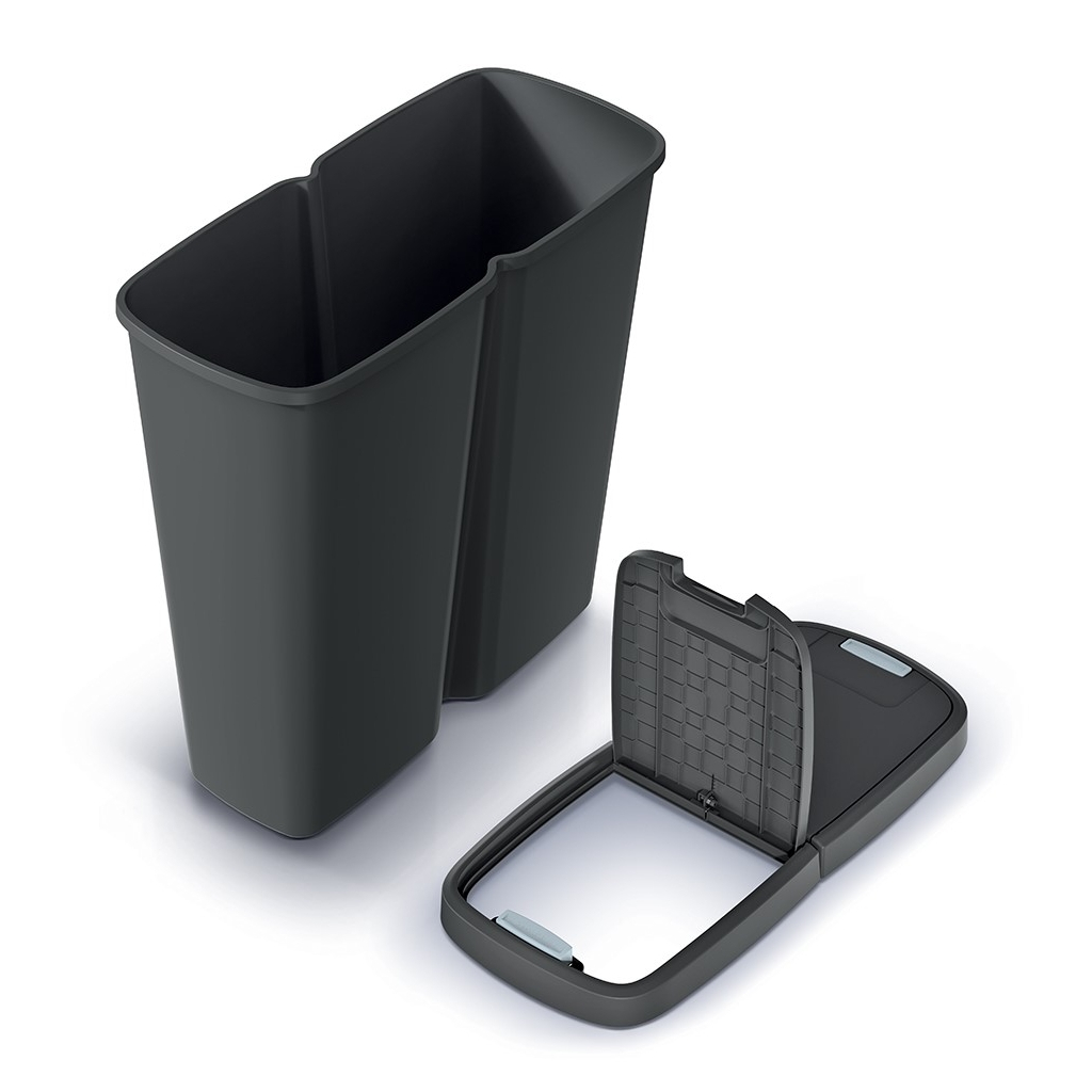 Tento odpadkový koš doporučujeme zejména do kancelářských prostor, ale také kamkoli, kde přijde vhod jeho unikátní konstrukce. Společný interiér je totiž přístupný hned přes 2 víka na protilehlých stranách. Koš tak může stát např. mezi stoly a pohodlně se k němu dostanete z obou stran.