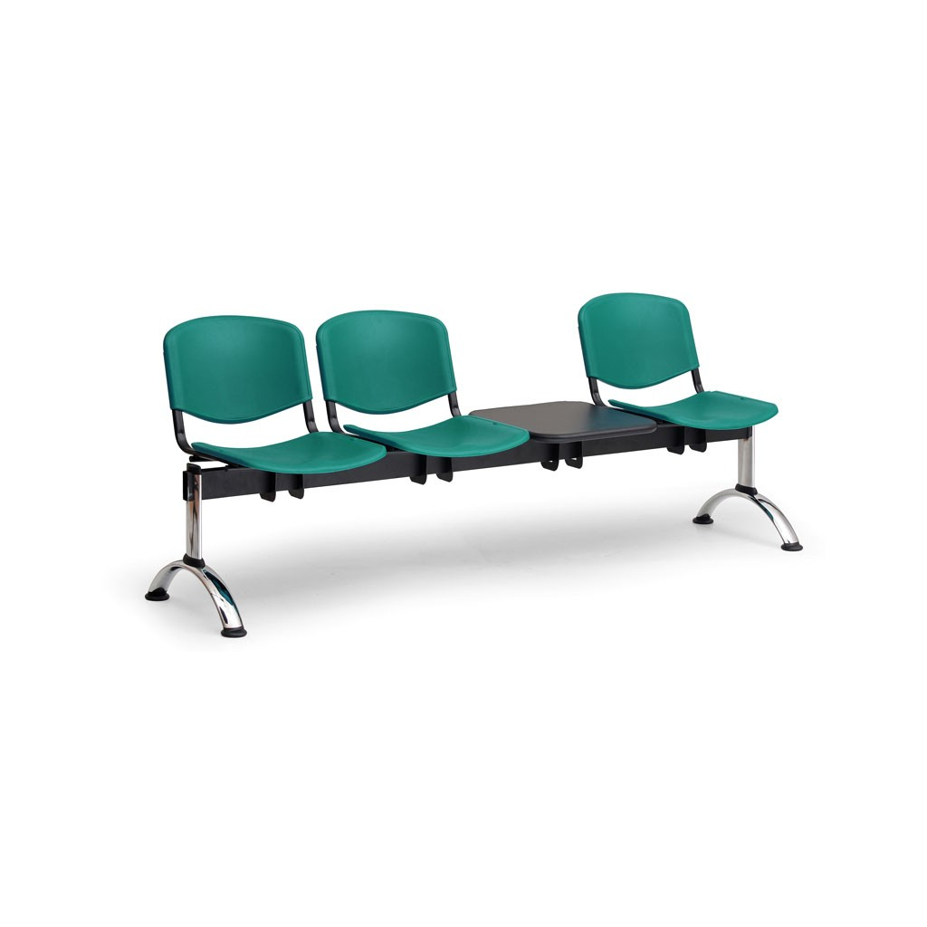 Plastová lavice ISO II v provedení s chromovanými nohami a odkládacím stolkem je skvělým vybavením do veřejných prostorů, hal či nejrůznějších typů čekáren. Jednotlivá místa k sezení jsou umístěna na ocelové konstrukci lavice a skládají se z plastových desek pro sedák i opěrák. Velkou výhodou plastové lavice je odolnost proti poškození a velmi snadná údržba včetně čištění.