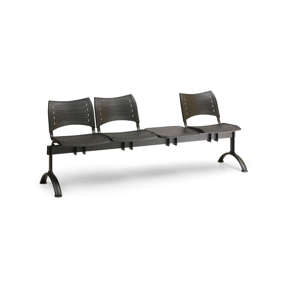 Plastová lavice VISIO v provedení s černými kovovými nohami a odkládacím stolkem je skvělým vybavením do veřejných prostorů, hal či nejrůznějších typů čekáren. Jednotlivá místa k sezení jsou umístěna na ocelové konstrukci lavice a skládají se z tvrzených plastových desek pro sedák i opěrák. Velkou výhodou plastové lavice je odolnost proti poškození a velmi snadná údržba včetně čištění.