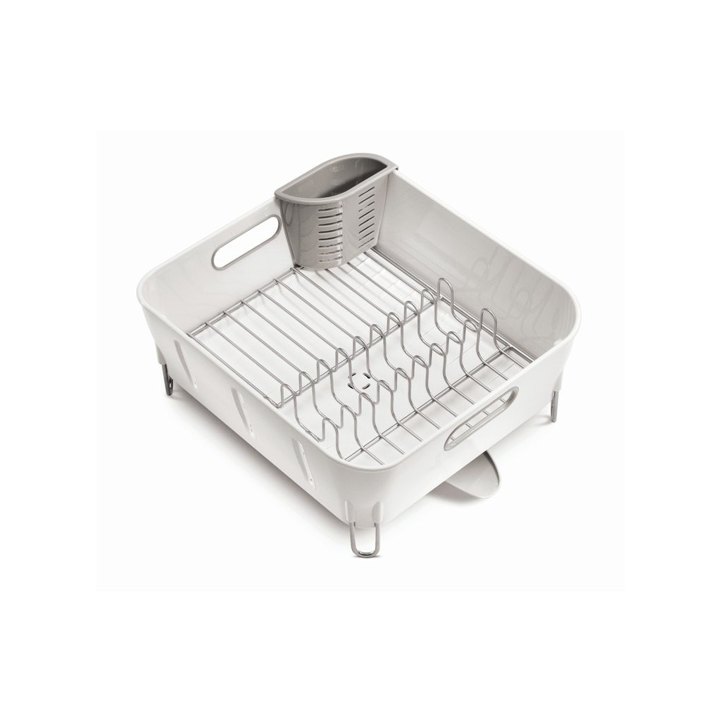 Je vyroben z odolného plastu v kombinaci s nerezovou ocelí. Má praktické nožičky, takže nestojí přímo na kuchyňské lince a neznečišťuje ji. Díky praktickým rozměrům se vejde i do dřezu. Součástí odkapávače je držák na příbory.