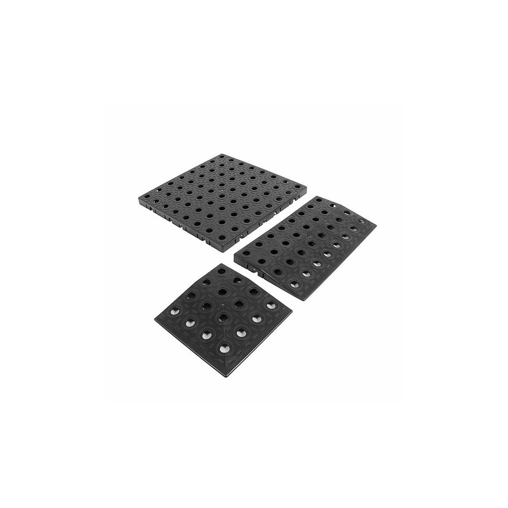 Balení obsahuje 20 ks dlaždic, 18 ks nájezdů, 4 ks rohů a spojky. Rozměr jednoho dílu je 25 × 25 cm, nájezdu