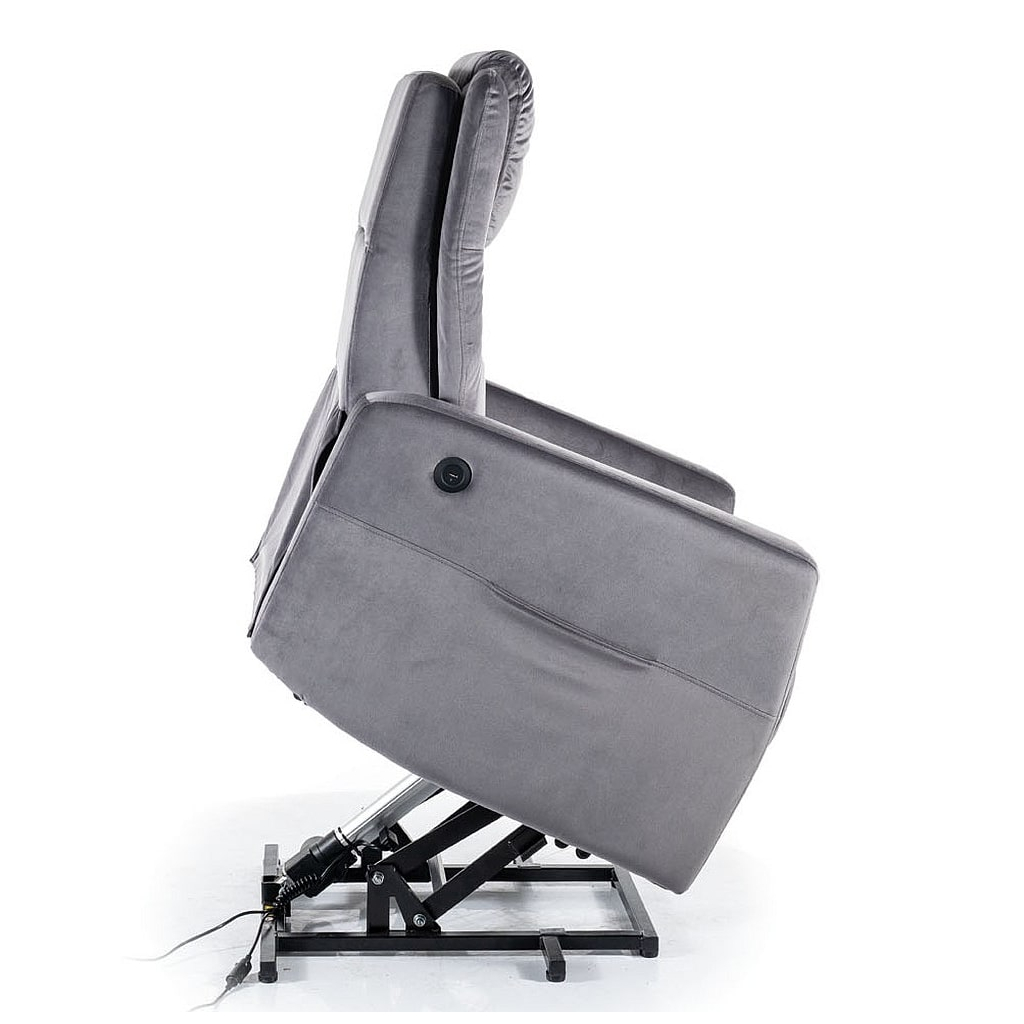 Změna polohy je u křesla Adonis Velvet otázka jediného stisku tlačítka – elektrický mechanismus obsluhuje jednoduchý ovladač, který si odložíte do praktické kapsy na pravé straně křesla. Hned vedle ní se nachází také USB napájecí port, takže můžete relaxovat třeba s tabletem a nebát se, že se vybije.