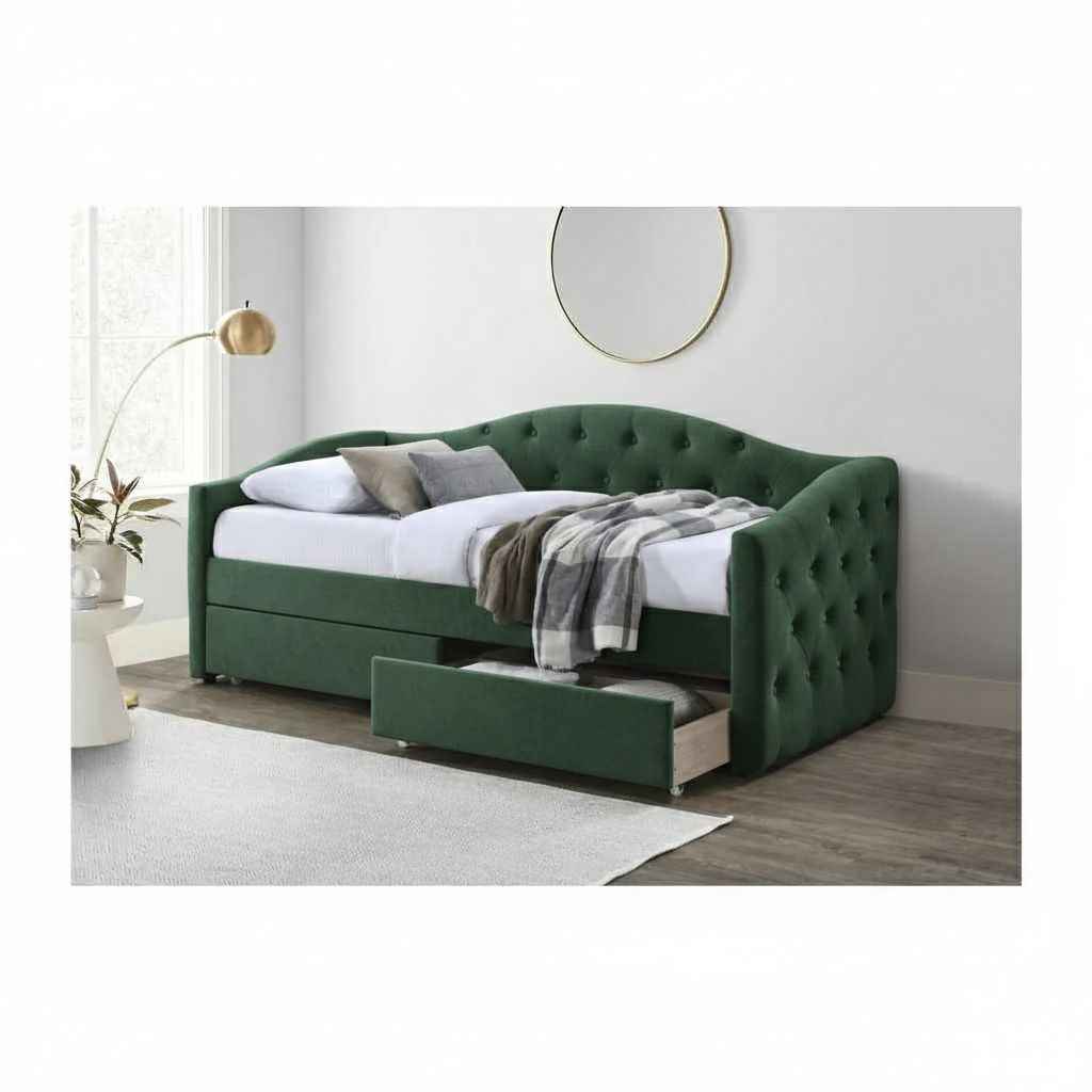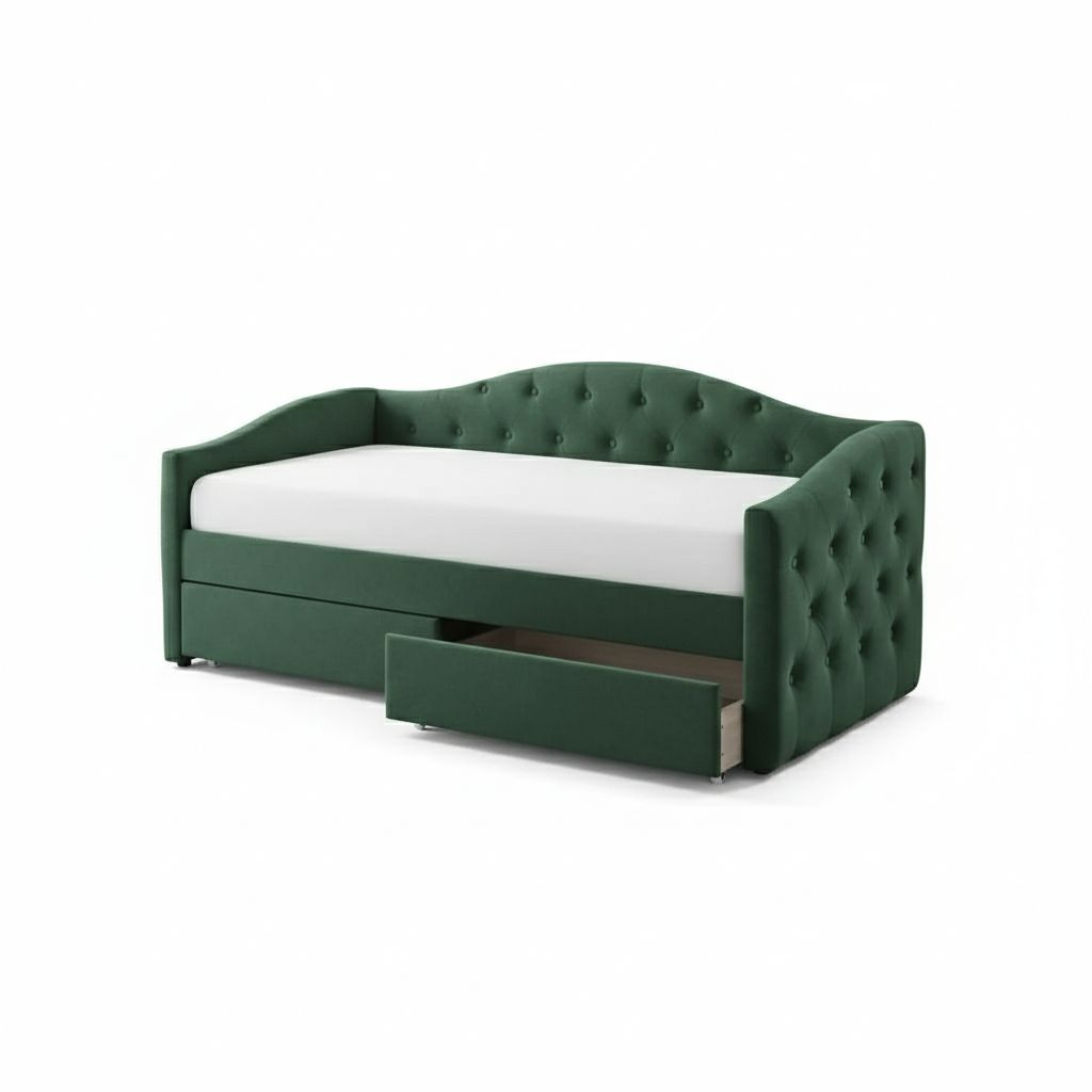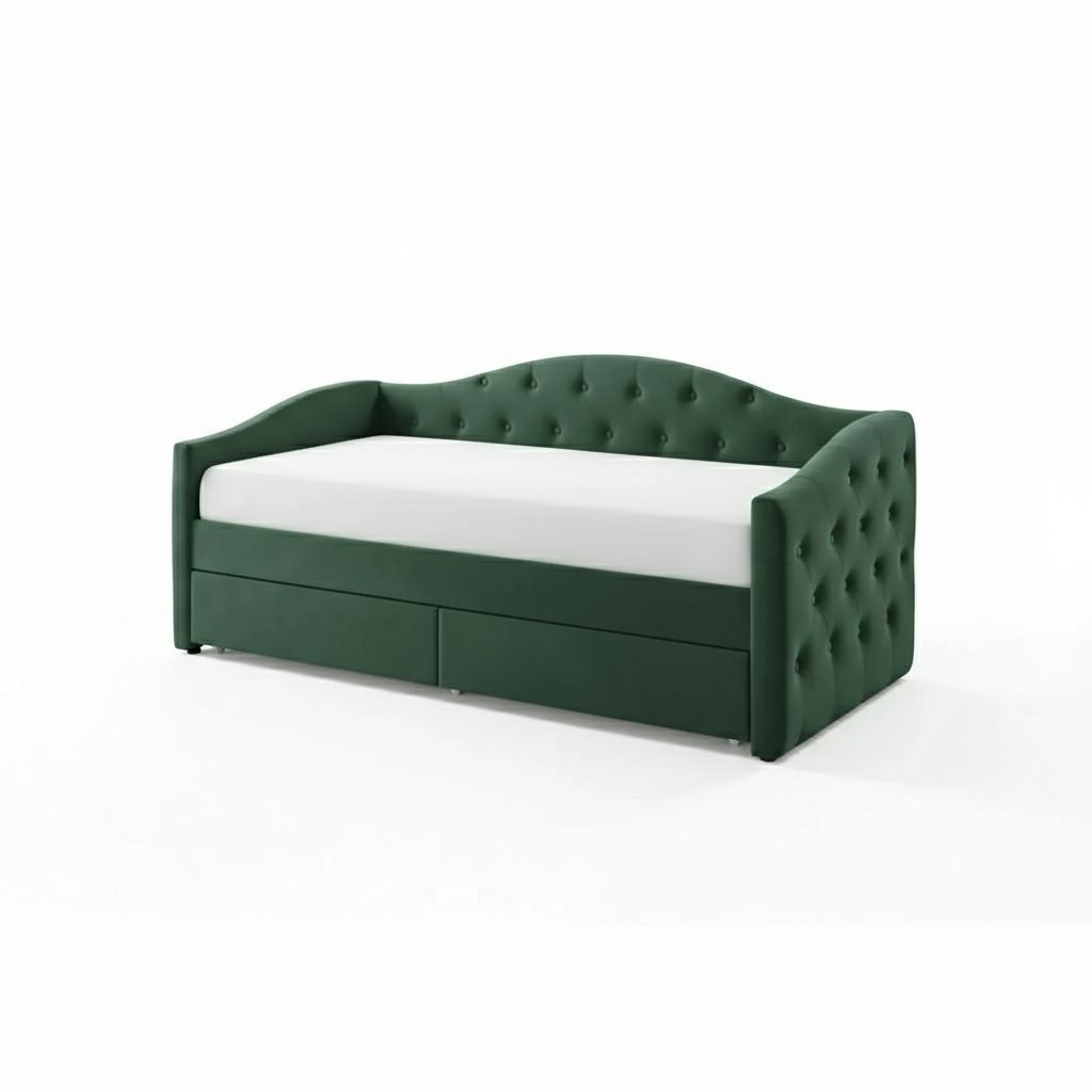 Na první pohled zaujme zvýšené čelo na boku postele. To, stejně jako zbytek postele, je čalouněné měkkou látkou, ke které se v noci rádi přitulíte. Šmrnc potahu dodávají ozdobné knoflíky. Konstrukci tvoří masivní kaučukové dřevo.