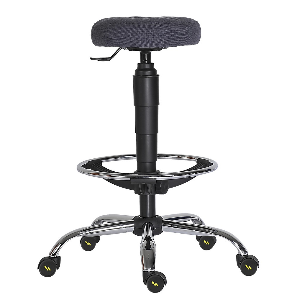 Pracovní židle Mini Antistatic je skvělou volbou do průmyslových prostorů, především pak do montážních hal k výrobním linkám. Její konstrukce je podobná taburetům, jelikož se skládá pouze z vysoké kovové stojny s praktickou opěrkou nohou, kříže a ergonomicky tvarovaného sedáku. Ten je potažený antistatickou látkou v barvě antracitu, která byla vyrobena za účelem odvádění statické elektřiny z pracoviště s přítomností elektronických komponentů a těkavých chemikálií.