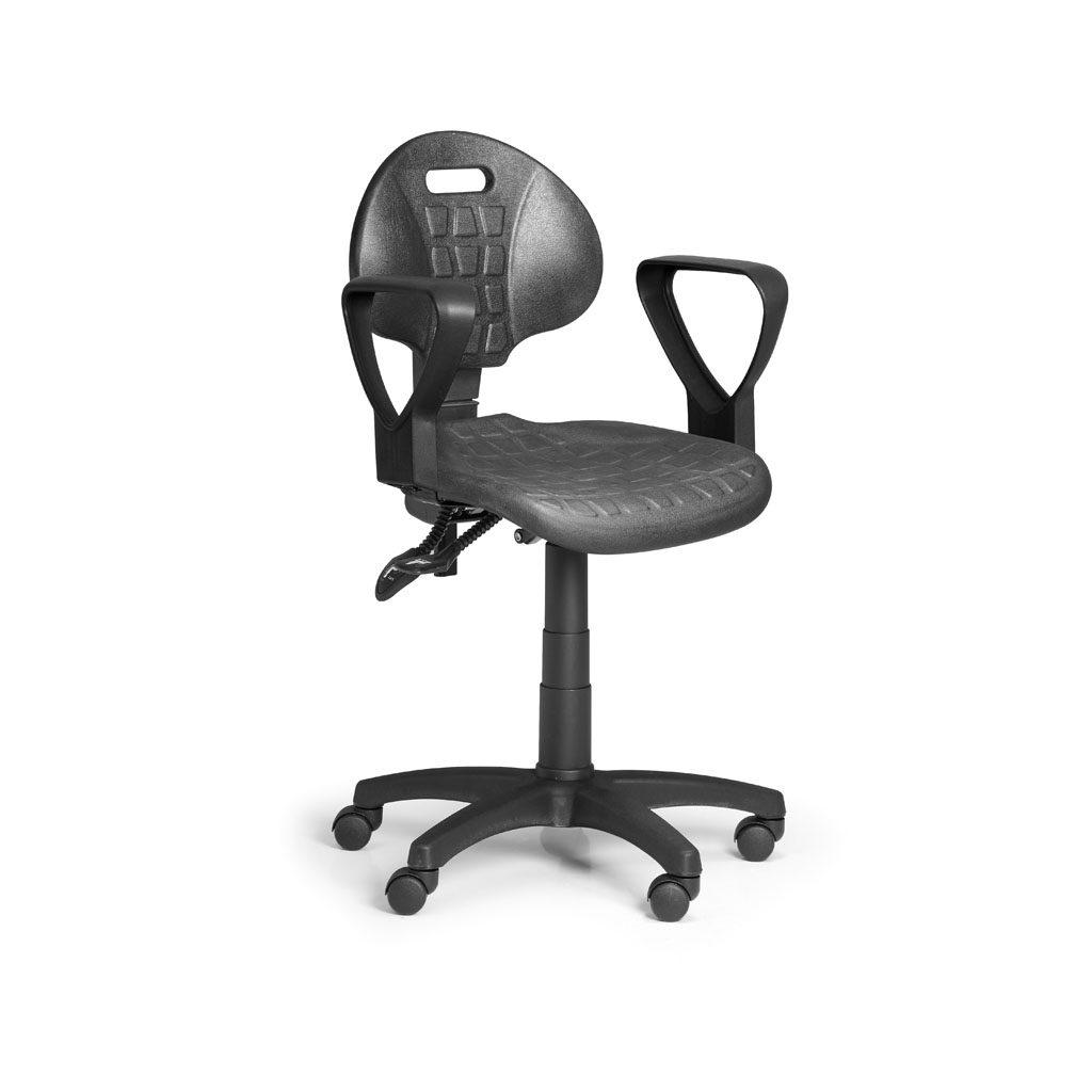 Pracovní židle PUR je skvělou volbou do průmyslových oblastí, zejména pak do montážních hal k pracovním linkám. Židle je vybavena pístem pro výškové nastavení a i díky vestavěným plastovým područkám zajistí při práci vždy příjemné sezení. Navíc obsahuje asynchronní mechaniku, která umožní pohodlné houpání.