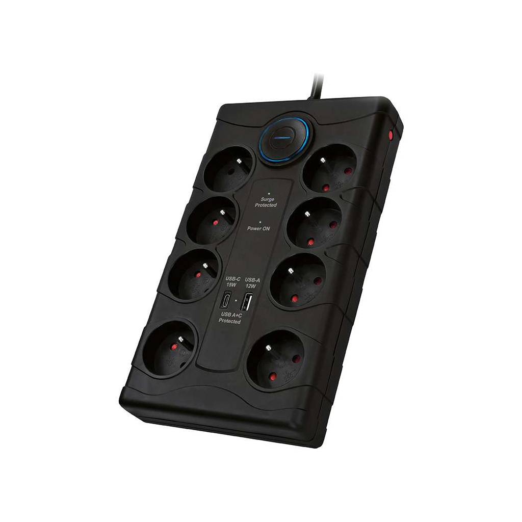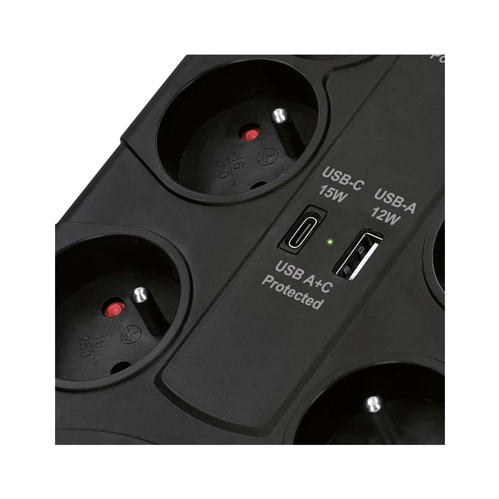 Dva USB porty – USB-A i USB-C – umožňují současné nabíjení více zařízení s celkovým výkonem až 17 W. Ochrana proti přepětí, přehřátí a zkratu zaručuje bezpečný provoz i při delším používání. Přepěťová ochrana tak pokrývá nejen zásuvky, ale i USB výstupy.