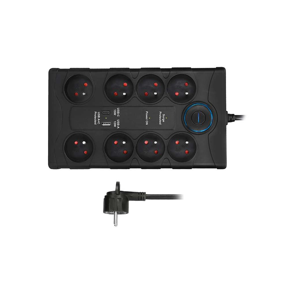 Přepěťová ochrana 8Z + USB A + USB C - 2m, černá