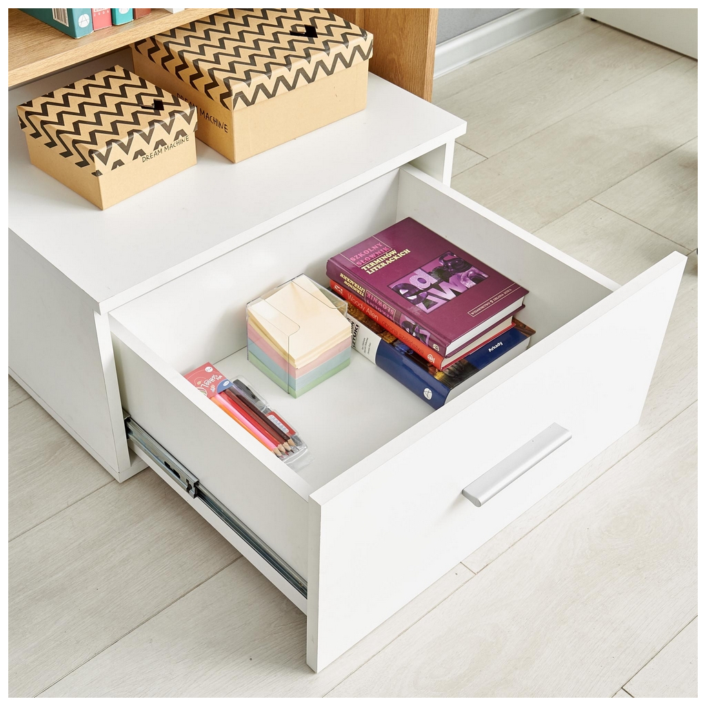 Grosso vám bude skvělým společníkem v pracovně nebo studentském pokoji. Funkci stolu totiž kombinuje s bohatým úložným prostorem ve formě regálu a prostorné zásuvky na levé straně.