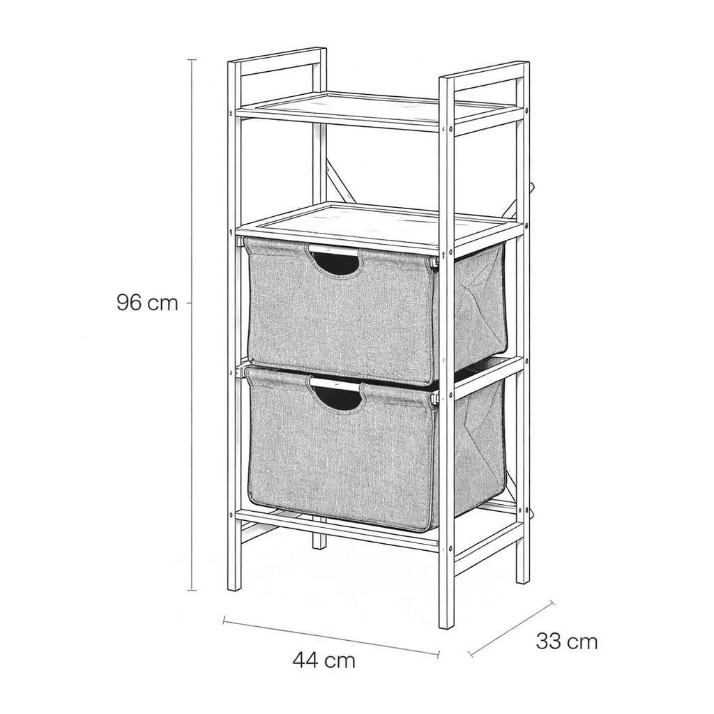 Lehká konstrukce tohoto regálu usnadňuje jeho přemístění podle potřeby, zatímco jeho kompaktní rozměry dovolují využití v různých místnostech – v koupelně, předsíni, ložnici i obývacím pokoji. Využijte horní police pro dekorace nebo užitečné předměty na dosah ruky a skryjte menší věci v látkových zásuvkách.