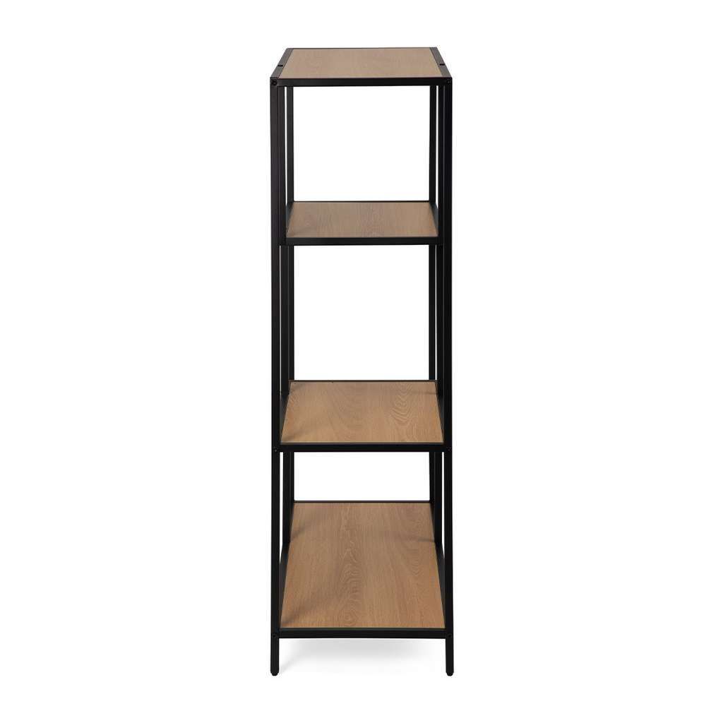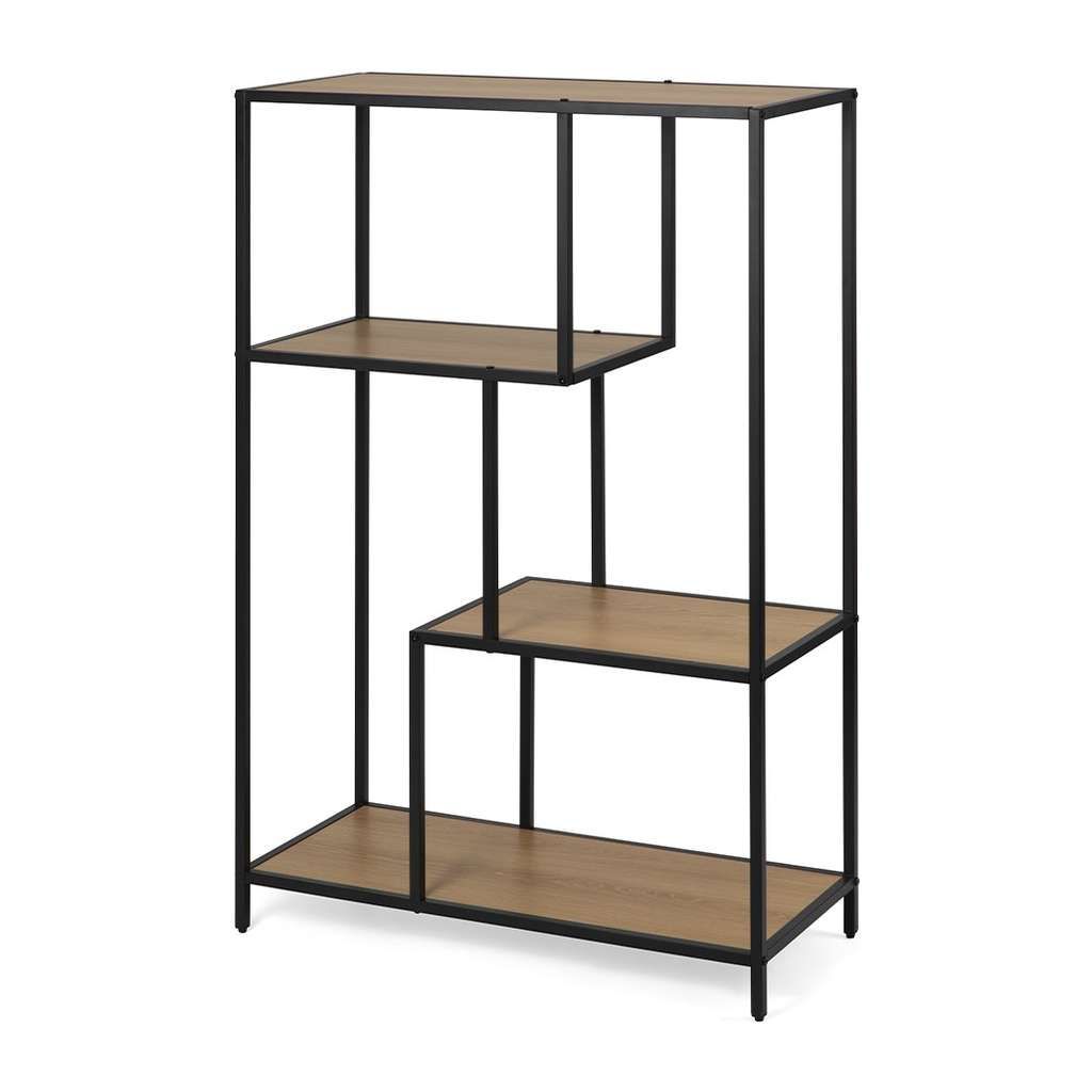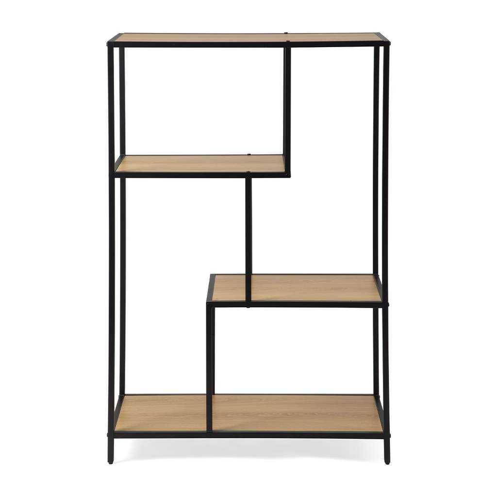 Díky otevřenému provedení regál nezabraňuje prostupu světla a nezatěžuje vizuálně prostor, což pomáhá udržet místnost světlou a vzdušnou. Asymetricky rozmístěné police poskytují dostatek místa k uspořádání knih, dekorací či dalších osobních předmětů a zároveň dodávají celku zajímavý a originální vzhled.